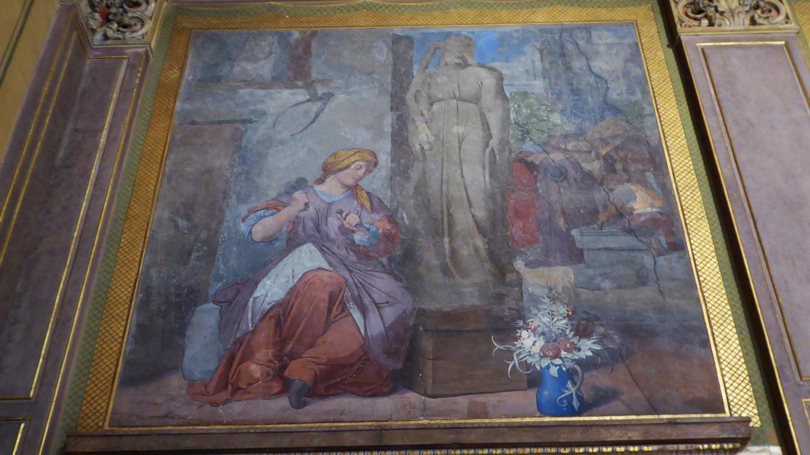 Die Staatliche Kunsthalle Karlsruhe ist mit ihren Kunstwerken, vor allem deutscher, französischer und niederländischer Meister, eines der bedeutendsten Museen Deutschlands. Das Hauptgebäude und die Orangerie bilden ein von Heinrich Hübsch zwischen den 30er und den 50er Jahren des 19. Jahrhunderts entworfenes und verwirklichtes Ensemble, das die romantische Vorstellung eines Gesamtkunstwerks überliefert. Im Jahre 1838 wurde die Ausmalung des Treppenhauses des Hauptgebäudes beschlossen. Im Mittelpunkt sollte die Einweihung des Freiburger Münsters durch Herzog Berthold, einem Zähringer stehen. Moritz von Schwind (1804-1871) wurde mit dem Entwurf und der Ausführung des Wandbildes beauftragt, das eine große Anzahl von Figuren vor dem Portal des Gotteshauses zeigt. Im Jahre 1842 beantragte Heinrich Hübsch eine Erhöhung der festgelegten Gesamtsumme, um neben dem Münsterbild weitere Bildfelder an den Wänden ausmalen zu lassen. Für die sieben mittleren Deckenfelder schuf der spätromantische Maler mit österreichischen Wurzeln vierzehn schwebende Engel. Die Lünetten, die Rundbogenfelder über dem Hauptbild, wurden ebenfalls von Schwind ausgeführt. Die beiden Äußeren thematisieren die ‚Phantasie‘ und die ‚Mathematik‘, die damals als Grundlage guter Baukunst galten. Der Titel des Freskos des mittleren Bogenfelds lautet ‚Die Architektur von Staat und Kirche beschützt‘. Nach 1842 malte der Künstler zusätzlich die beiden quadratischen Felder über den Türen aus, die in die Sammlung führen. Das linke Fresko zeigt „Sabine, Tochter Erwins von Steinbach mit der Bildhauer-Arbeit des Straßburger Münsters beschäftigt“. Das rechte Wandbild gibt wieder, wie Herzog Berthold der Reiche durch den Maler Baldung Grien porträtiert wird.