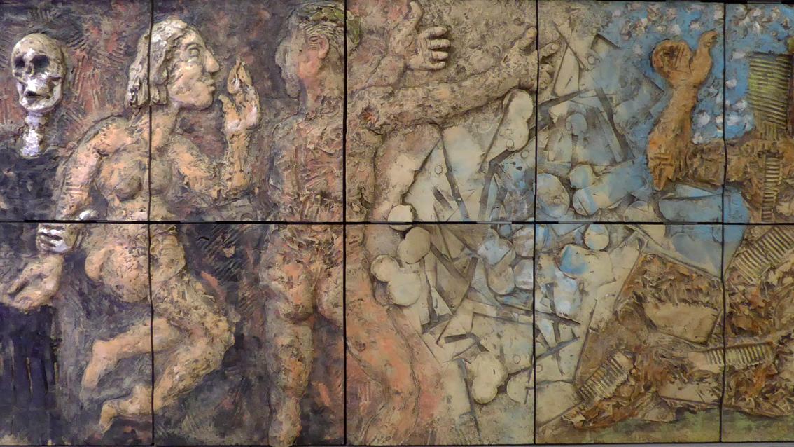 Markus Lüpertz entwarf und verwirklichte für sieben U-Bahn Stationen vierzehn monumentale Wandbilder aus Ton. Ein Relief wurde in der Karlsruher Majolika und die weiteren in der Zeller Keramik-Manufaktur hergestellt. Alle Werke sind zwei Mal gebrannt (Sprüh- und Glasurbrand). Keramik gilt als ein sehr haltbares, witterungsbeständiges Material und ist deshalb für den öffentlichen Raum gut geeignet. Initiiert und finanziert wurde das Projekt von dem Verein ‚Karlsruhe Kunst Erfahren e.V.‘. Entstanden ist eine subjektive Deutung der Schöpfungsgeschichte in Form farbig gefasster Hochreliefs. Diese sind in einer Bildsprache ausgeführt, welche die Wirklichkeit expressiv abstrahiert und surreal überhöht. Sämtliche Keramikbilder werden für 7 Jahre der Stadt Karlsruhe als Leihgabe des Vereins ‚Karlsruhe Kunst Erfahren e.V.‘ überlassen. - ‚Von schönster Gestalt‘ bezieht sich auf die tragische Liebesgeschichte zwischen Orpheus und Eurydike. Die Götter erlauben Orpheus Eurydike aus dem Hades zurück in die Welt zu holen, vorausgesetzt er dreht sich nicht nach ihr um. Wie das Bild zeigt, hält er sich nicht daran. Begleitet vom Klirren des zerbrochenen Spiegels zur Welt, verliert er endgültig seine Geliebte. Die Arbeit ‚Die Königswürde’ zeigt links einen ‚Schneckenmann‘ mit Totenschädel unter rot gefassten Formen, die an Feuer erinnern. Rechts sind zwei Figuren von vorne und eine von hinten dargestellt. Auf dem Oberteil der Person am rechten Bildrand ist ein Kopf mit zwei Hörnern zu sehen. - Markus Lüpertz wurde am 25. April 1941 in Reichenberg geboren. Zwischen 1973 und 1986 lehrte er an der Staatlichen Akademie der Bildenden Künste in Karlsruhe. Von 1988 bis 2009 war er Rektor an der Kunstakademie Düsseldorf. Lüpertz ist in erster Linie Maler, allerdings entstehen seit etwa 1980 immer wieder plastische Arbeiten.