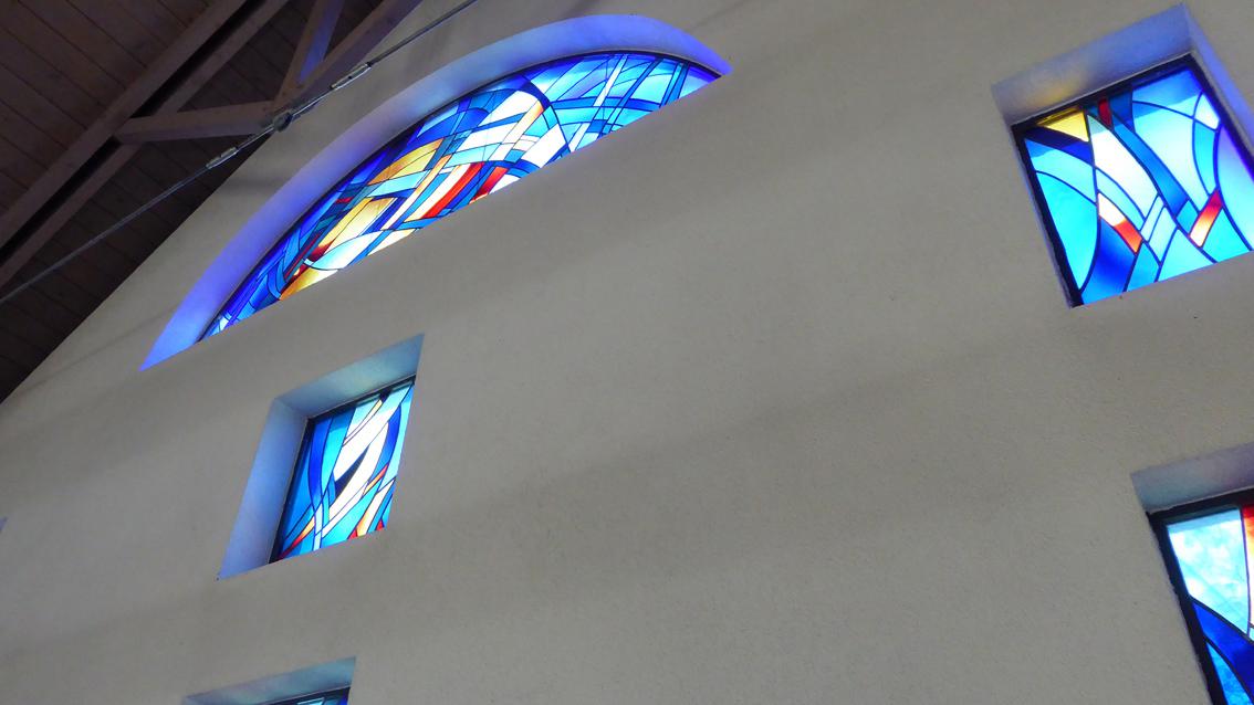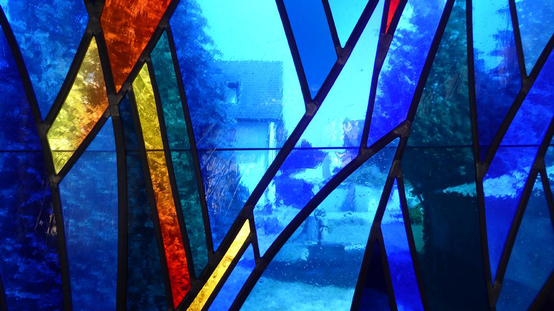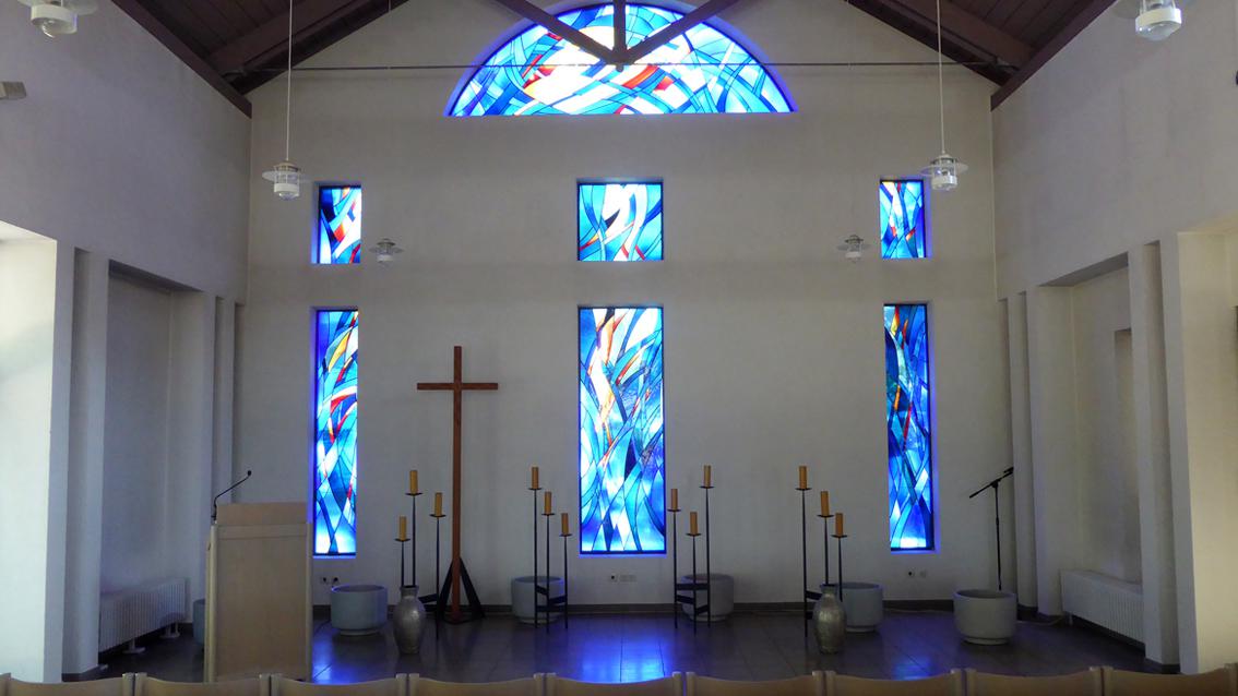 Das Karlsruher Künstlerpaar Barbara Jäger und OMI Riesterer ist in Karlsruhe und Umgebung mit künstlerischen Interventionen im öffentlichen Raum und an Gebäuden mehrfach vertreten. In der Aussegnungshalle des Friedhofs in Aue füllten sie die Öffnungen der Hauptwand mit farbigem Glas. Sich durchdringende Bögen in Abstufungen der Grundfarben Blau, Gelb und Rot bilden insgesamt sieben Flächen. Im Bogenfeld herrschen Formen mit horizontaler, in den schlanken Hochformaten mit vertikaler Ausrichtung vor. Die Gesamtkomposition ist von einer farbintensiven Dynamik getragen, die sich von der Sachlichkeit der Architektur und der Einrichtung kontrastreich abhebt.