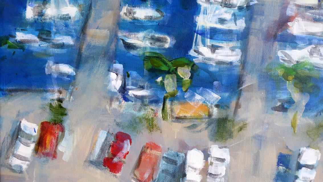 Der Karlsruher Künstler deutet eine Hafenansicht mit den Mitteln der Malerei aus der Perspektive eines Vogels. Dabei beschreibt er mit schnell und entschieden gesetzten Pinselhieben das leicht bewegte Meer und den Strandabschnitt mit den wenigen Gebäuden, dem Kran, den zahlreichen Booten und Automobilen. Während das fast zwei Drittel der Bildfläche einnehmende Meer mit Abstufungen der Farbe Blau Ruhe und Tiefe ausstrahlt, ist der Festlandteil bestimmt von Kleinteiligkeit und Mehrfarbigkeit. Das ohne Vorlage, gleichsam aus der Vorstellung eines Hafens entwickelte Bild befindet sich an einer Wand der Neurochirugie im Haus R des Klinikums. Dem Künstler wurde von den Ärzt*innen zurückgemeldet, dass dem Kunstwerk von den Patient*innen eine wohltuende Ausstrahlung zugeschrieben wird. Johannes Gervé wurde 1965 in Karlsruhe geboren und studierte von 1984 bis 1991 an der Staatlichen Akademie der Bildenden Künste Karlsruhe bei Prof. Klaus Arnold.