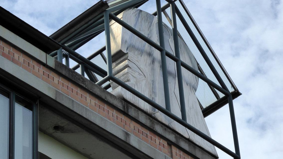 Für den Anbau des Kunsthallenflügels durch Hans Mohl Anfang der 80er Jahre des letzten Jahrhunderts gestaltete der international anerkannte Künstler seinen ‚Karlsruher Kopf‘. In lichter Höhe unter einer glasüberdachten Giebelhauskonstruktion installiert, ist von unten kaum zu erkennen, dass dem silberfarbenen Kopf noch eine stilisierte Figur (‚Kopffüßler‘) eingeschrieben ist.