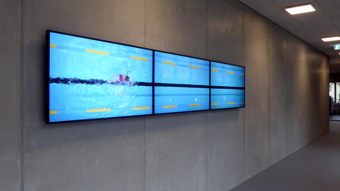 Anfang des Jahres 2021 installierte Markus Kiefer seine Videoinstallation mit dem Titel ‚Lagen‘. Der Künstler gewann mit diesem Werk einen Kunst-am-Bau Wettbewerb, der anlässlich des Neubaus der Drais-Gemeinschaftsschule ausgelobt worden war. Gegenstand der aus drei Monitoren und einer Sitzbank bestehenden Installation sind schwimmende Schüler*innen und Lehrer*innen verschiedenen Alters, unterschiedlicher Hautfarbe, mit und ohne Behinderungen. Sie ziehen beharrlich ihre Bahnen in den für sie typischen Schwimmstilen, in unterschiedlichen ‚Lagen‘ eben. Markus Kiefer wurde im Jahre 1971 in Freiburg geboren. Er studierte an der Kunsthochschule in Mainz, wo er 2002 sein Diplom machte (Filmklasse Prof. Dr. Harald Schleicher) und 2004 Meisterschüler wurde. Der Künstler lebt und arbeitet in Karlsruhe.