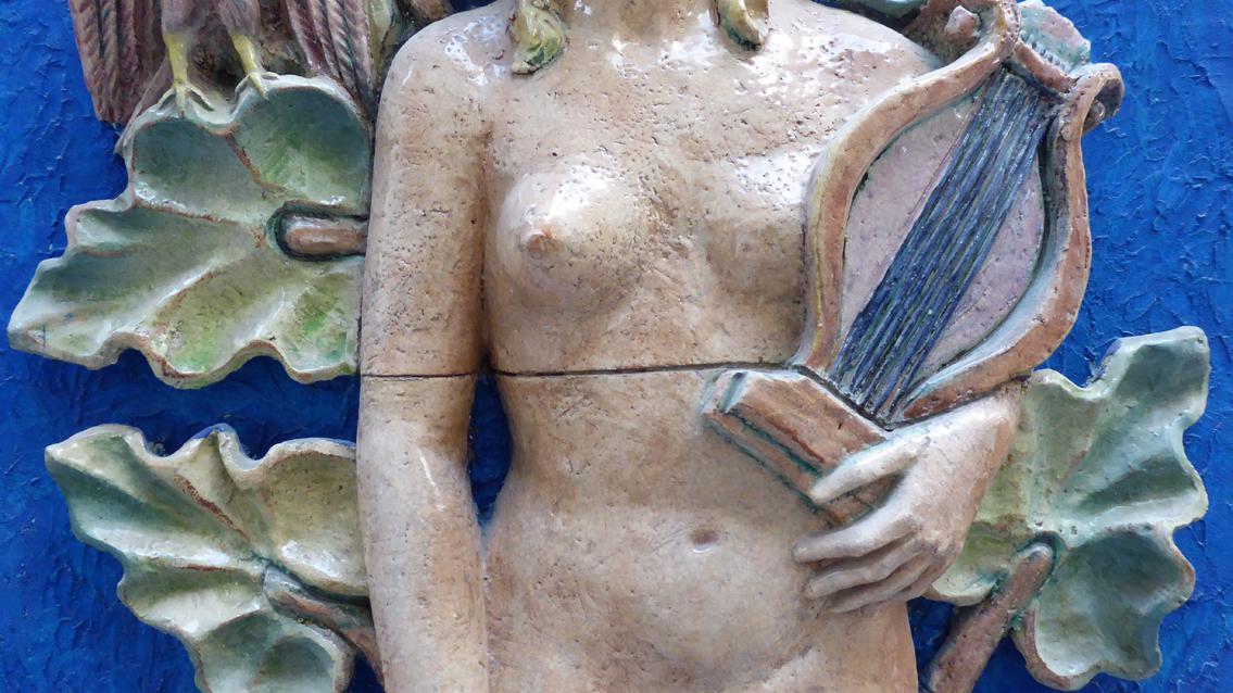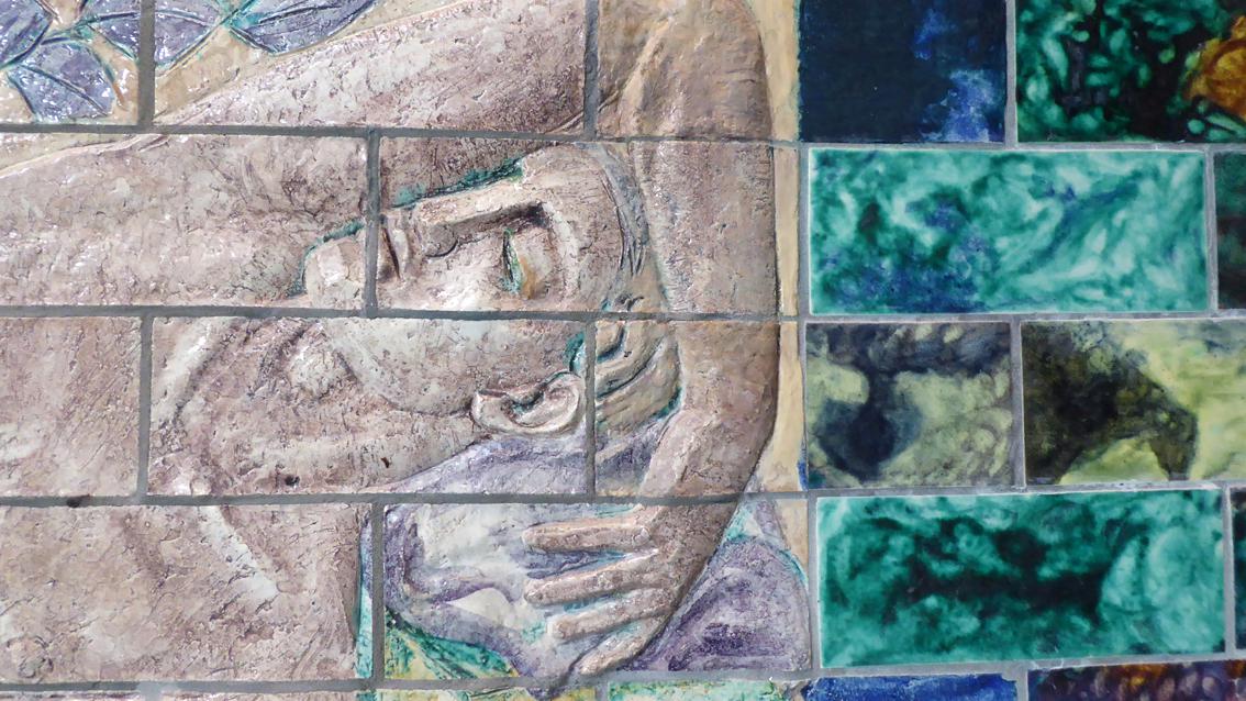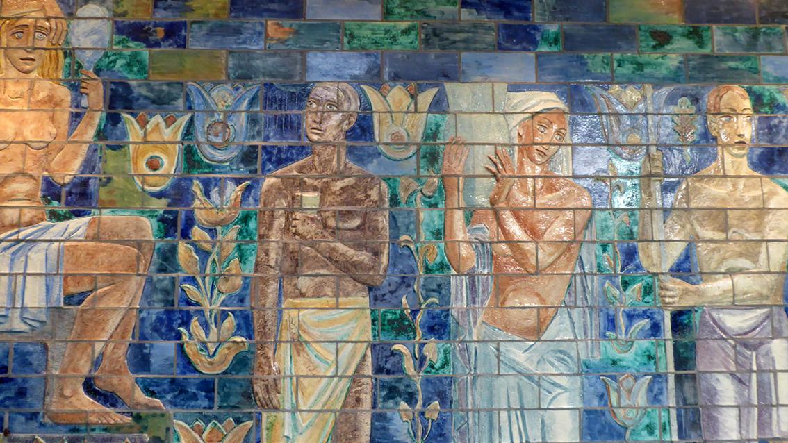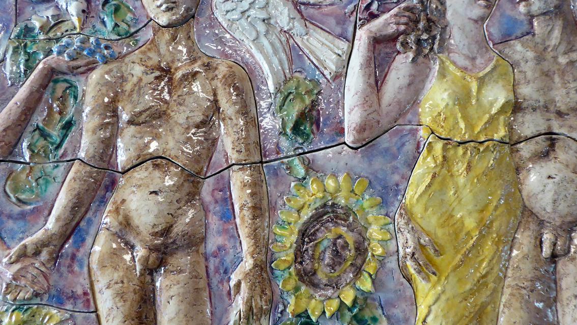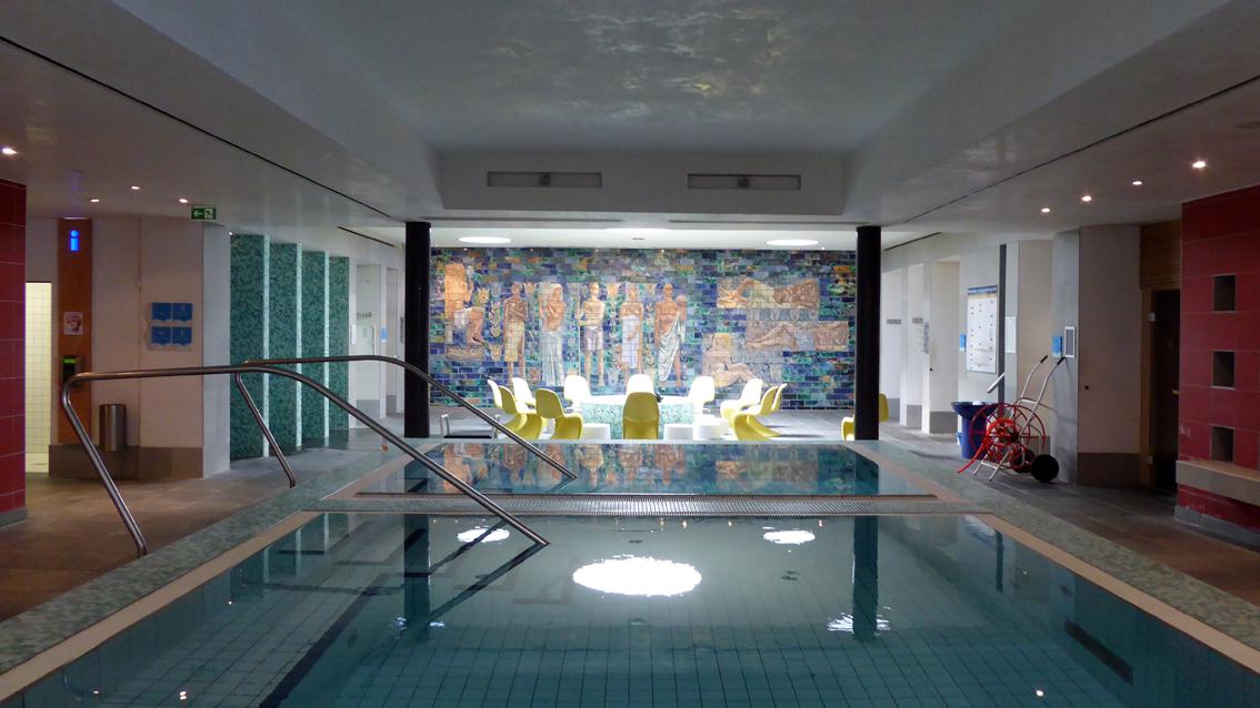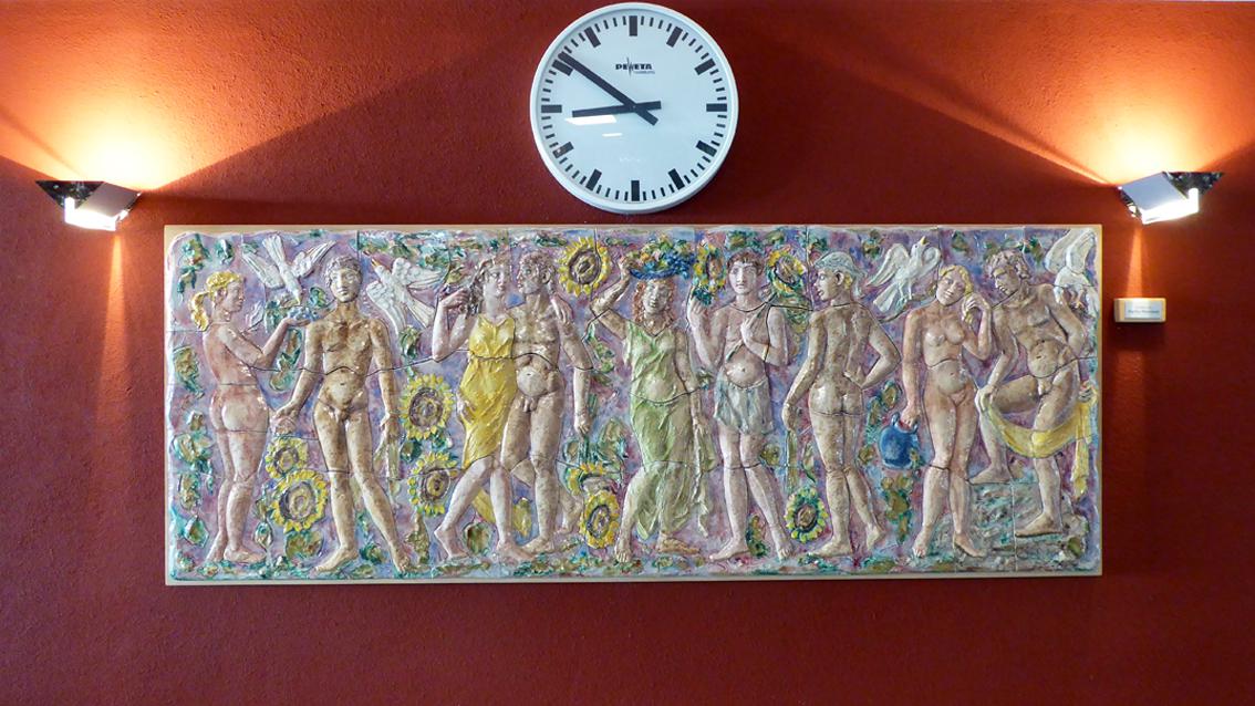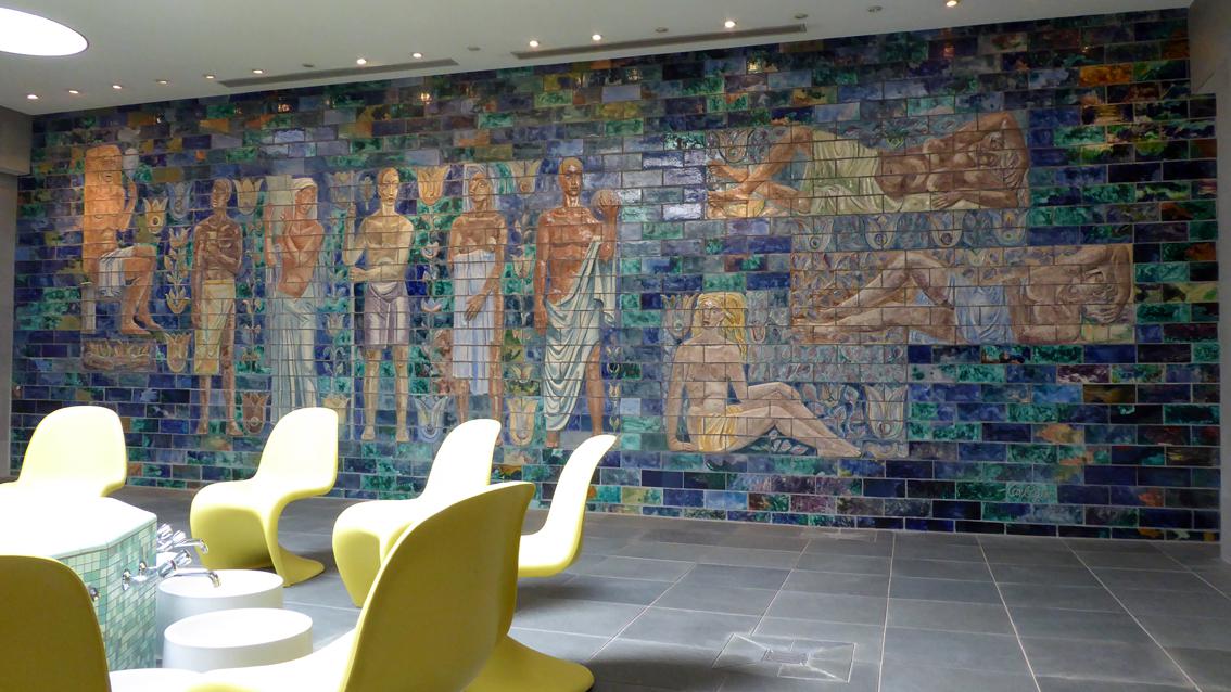 In der Halle des heutigen Wellnessbereichs füllt ein großformatiges Keramikbild eine ganze Wand aus (ca. 10/2,3 m), das leicht bekleidete Frauen und Männer, stehend, sitzend und liegend zeigt. Die Blicke sind unterschiedlich ausgerichtet. Die Gruppe ist von stilisierten Pflanzen und vielfarbigen rechteckigen Kacheln umgeben. Auf der gegenüber liegenden Wand befinden sich junge Männer und Frauen zwischen Blumen und Vögeln (ca. 87/228/3 cm). Einige von ihnen sind leicht gekleidet, andere völlig nackt. Das Kunstwerk wurde im Jahre 2012 von der damals 85 jährigen Agathe Rheinbold, einer Stammbesucherin des Bades, dem Vierordtbad als Schenkung überlassen. Im Übergangsflur Richtung Ausgang ist eine Darstellung der Artemis angebracht, ihr ist als Attribut die Lyra zugeordnet (ca. 130/60/10 cm). Die drei reliefartigen Arbeiten sind sehr gut erhalten und stammen aus den 50er und 60er Jahren des letzten Jahrhunderts. Die Werke entstanden in Zusammenarbeit mit der Staatlichen Majolika Manufaktur Karlsruhe.