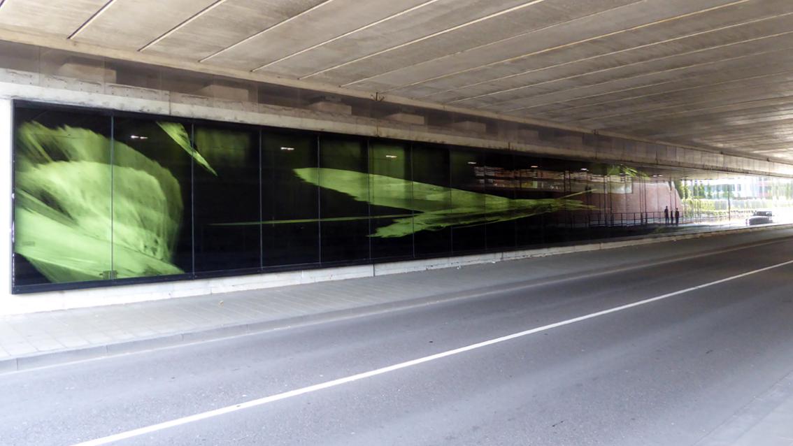 Das großformatige Kunstwerk zeigt vergrößerte Motten im Flug. Die Motive sind auf Glas gedruckt und hinterleuchtet. Auf subtile Weise antwortet die Arbeit auf die Besonderheit des Ortes, eine Straßenunterführung, in der sich Menschen und Fahrzeuge entlang der ca. 60 Meter breiten und ca. 3 Meter hohen Lichtinstallation ganztägig bewegen. Je nach Distanz und Geschwindigkeit eröffnen sich unterschiedliche Ansichten.