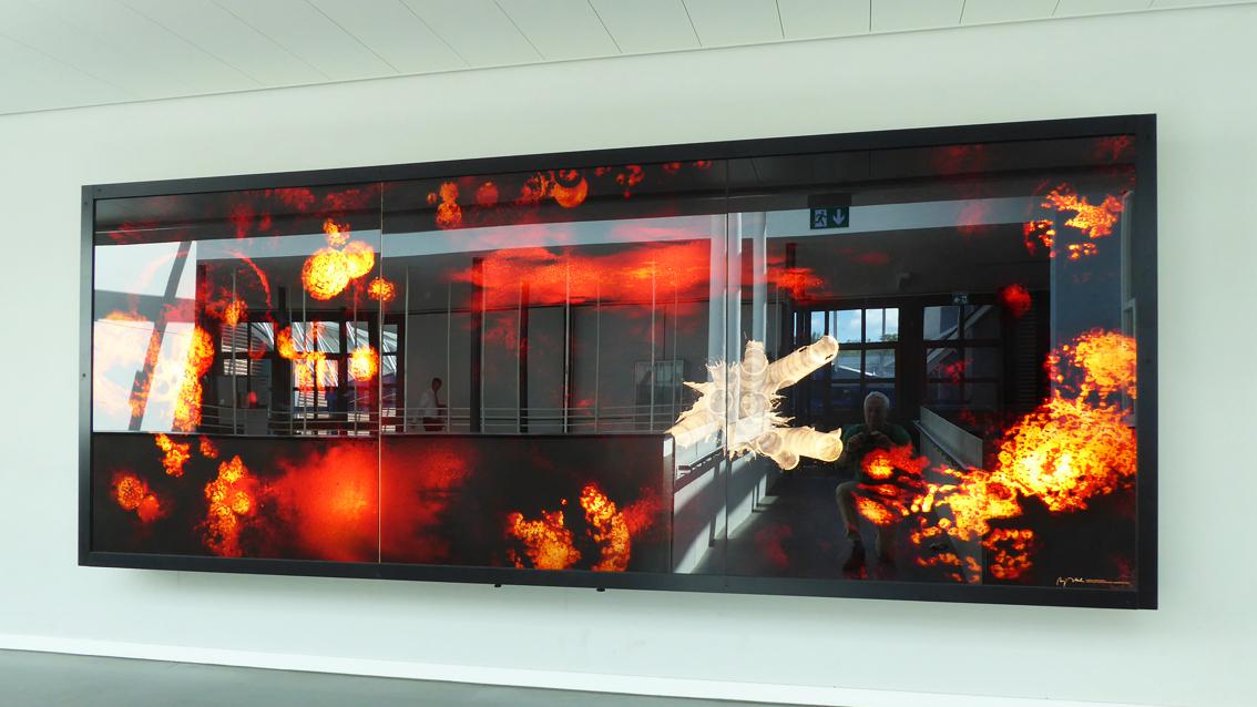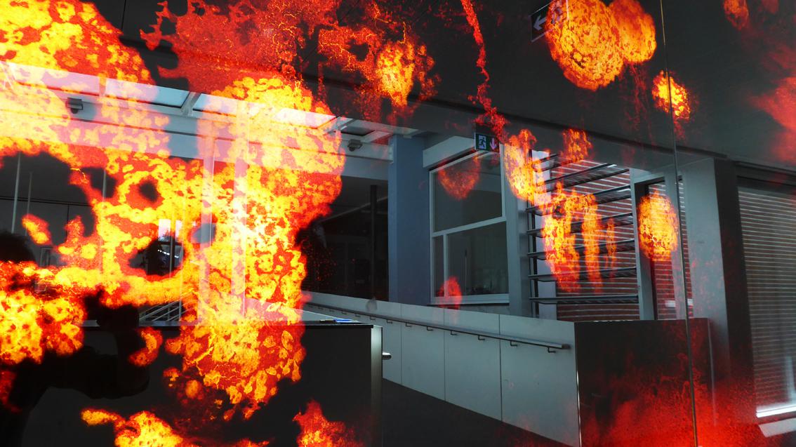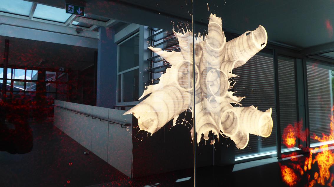 Margit Abele installierte im neuen Anbau des Gymnasiums, das den Namen des Begründers der Quantenphysik trägt, ein ausdrucksstarkes, hinterleuchtetes Kunstwerk. Ihr großformatiger, illusionistischer Bildraum gibt den Blick frei auf eine kosmische Parallelwelt, die bestimmt ist von Urgewalt, Grenzenlosigkeit und Geheimnis. „‘Saat‘ ist den Lehrern gewidmet, die junge Menschen neugierig und stark werden lassen, um fremdes Terrain zu betreten. Und natürlich den Schülern, die es wagen, ihrem Stern zu folgen.“, so die Künstlerin über ihr Kunstwerk. Margit Abele studierte von 1984 bis 1989 an der Staatlichen Akademie der Bildenden Künste Karlsruhe. Verschiedene Stipendien führten sie unter anderem nach Paris und Budapest.