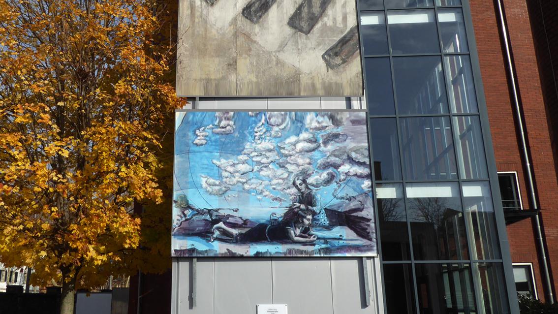 Die Malerin ist Mitglied des Künstler*innenvereins ‚PlakatWandKunst‘. Seit Jahren ist diese Gruppe in der Stadt Karlsruhe, in der Region und darüber hinaus mit temporären Aktionen im öffentlichen Raum aktiv. Verbindendes Konzept ist, dass die individuellen, künstlerischen Ideen auf Holzplatten und in dem Format 260 cm auf 360 cm verwirklicht werden. Die Träger der Raumfabrik haben Werke einzelner Künstler*innen der Gruppe in den vergangenen Jahren erworben und an verschiedenen Stellen der Gebäude des Anwesens fest installiert. Auf Eva Schäubles Bild ‚Seltsames Spiel‘ sind zwei Frauen zu sehen, deren Zusammensein gleichermaßen Nähe und Distanz ausstrahlt. Durch die vielen Nuancen der Farbe Blau ist die Begegnung am Strand unter freiem Himmel mit einer gewissen Sachlichkeit, fast Kühle hinterlegt. Die Karlsruher Künstlerin studierte zwischen 1972 und 1977 an der Staatlichen Akademie der Bildenden Künste Karlsruhe bei Prof. Hans Baschang, Prof. Peter Ackermann und Prof. Markus Lüpertz. Im Jahre 2016 wurde ihr künstlerisches Werk mit dem Kunstpreis der Stadt Baden-Baden ausgezeichnet.