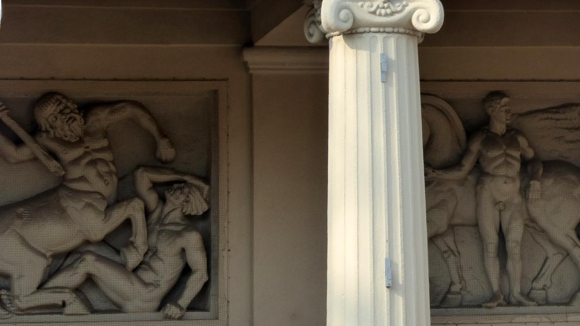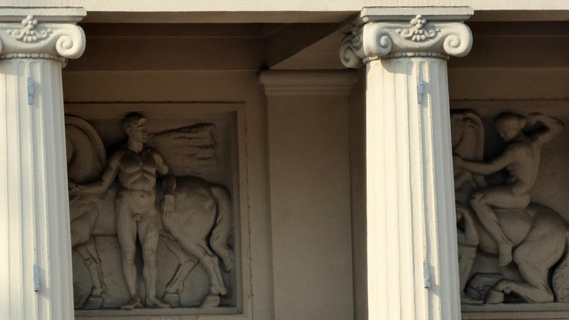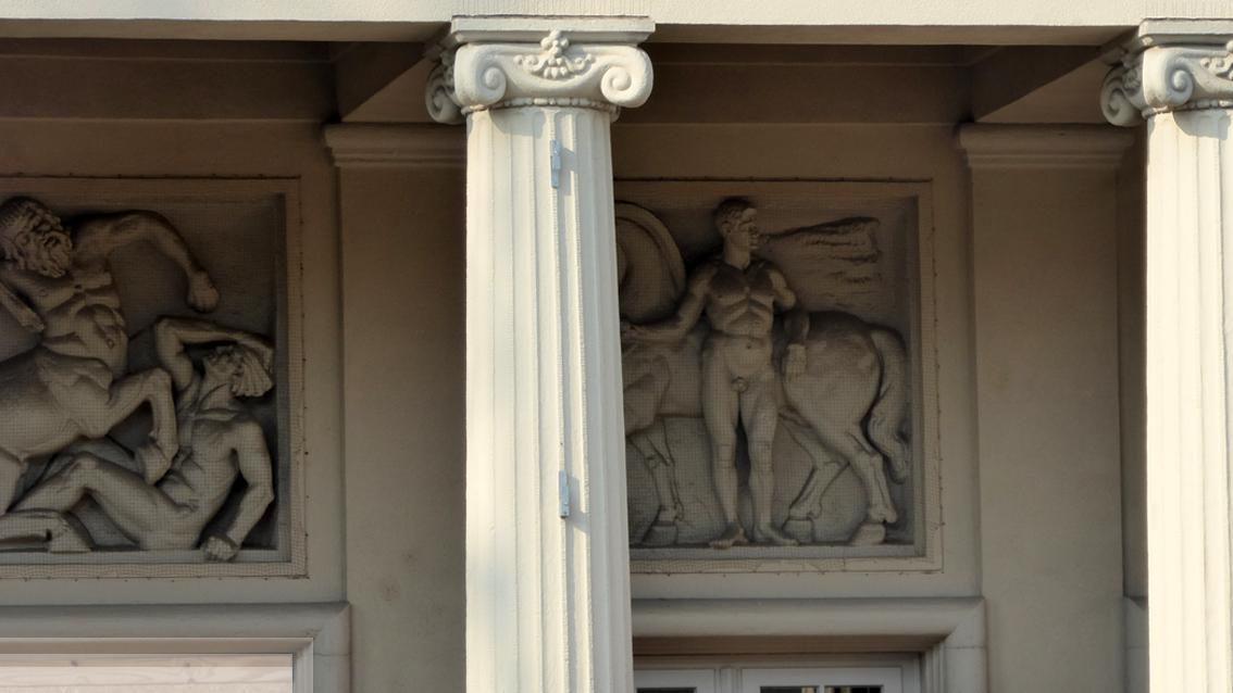 An der von Curiel und Moser im Jahre 1915 fertiggestellten Stadthalle gestaltete der Bildhauer die Supraporten im Zugangsbereich mit Motiven aus der griechischen Mythologie. Der Figurenstil orientiert sich an der Reliefkunst der klassischen Antike, die er während eines längeren Aufenthalts in Italien kennengelernt hatte. Schreyögg studierte ab 1884 an der Staatlichen Akademie der Bildenden Künste München. Im Jahre 1909 wurde er Professor an der Kunstgewerbeschule in Karlsruhe, von 1911 bis 1914 unterrichtete er zudem an der Großherzoglichen Malerinnenschule, die unter der Schirmherrschaft von Luise von Preußen stand. Erst ab 1915 waren Frauen zum Kunststudium an der Großherzoglich Badischen Kunstschule zugelassen, die von Großherzog Friedrich I. gegründet wurde und die die Vorläufereinrichtung der Staatlichen Akademie der Bildenden Künste Karlsruhe war. Von 1920 bis 1932 lehrte Georg Schreyögg dort Bildhauerei.