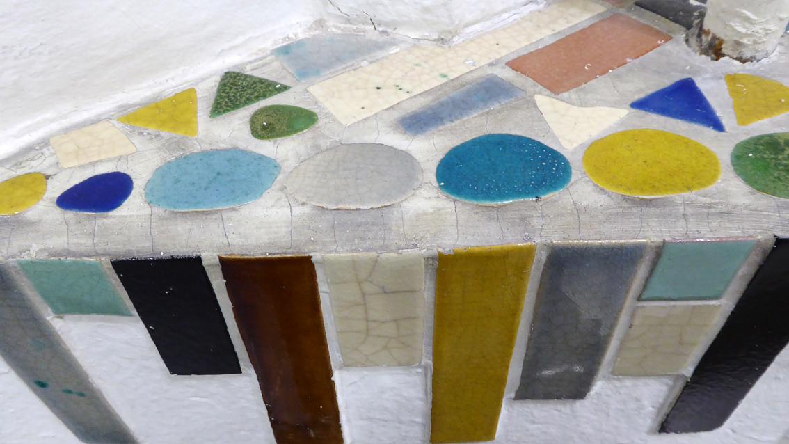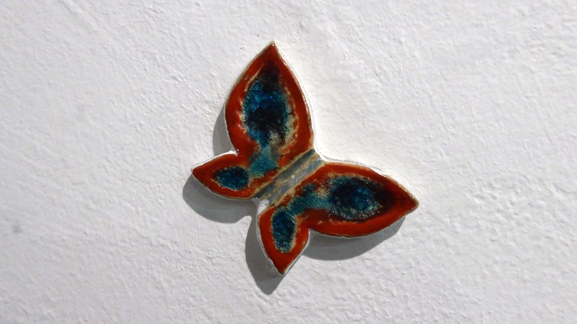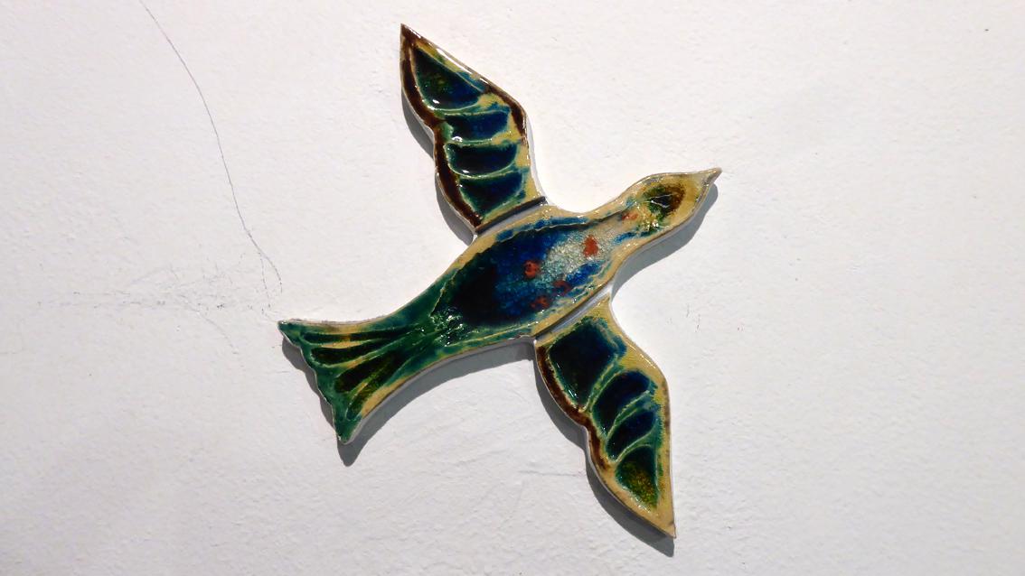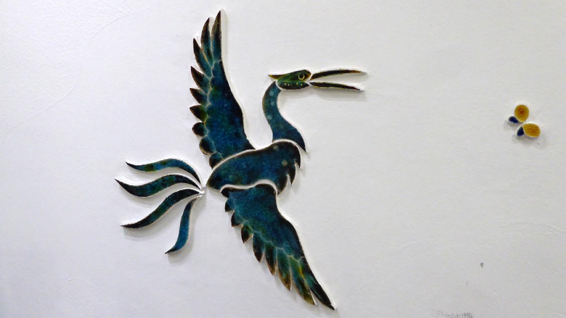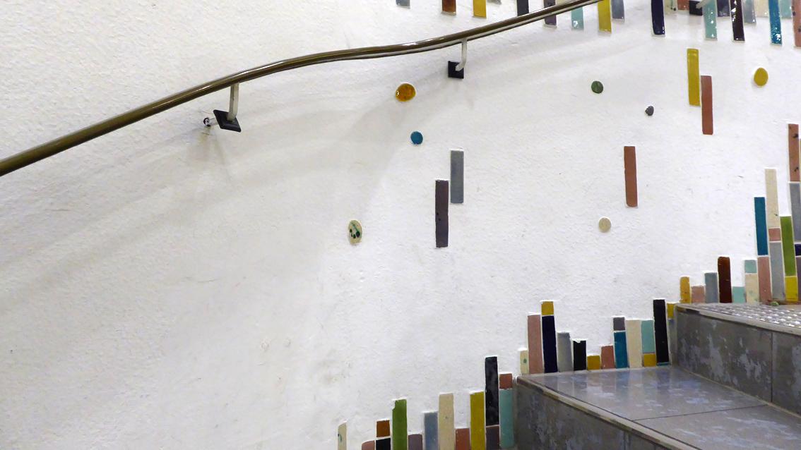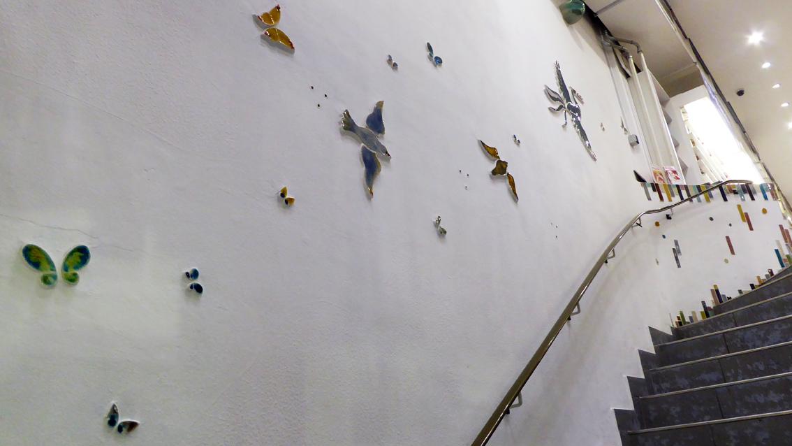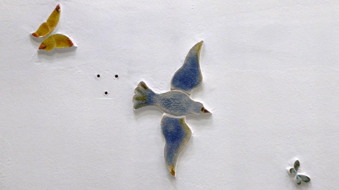 Der Weg zur CD- und Schallplattenabteilung des Musikhauses Schlaile führt über eine Treppe entlang einer hohen Wand. Auf dieser sind in unterschiedlichen Abständen Vögel und Schmetterlinge angebracht, die sich in den verschiedensten Farben und Formen vom weißen Hintergrund kontrastreich abheben. Im Zentrum der Installation steht ein großer Phantasievogel in Türkisblau, der nach einem Schmetterling in Gelb und Blauviolett schnappt. Die Gestaltung, die unten figürlich beginnt und oben abstrakt endet, verantwortete eine Gruppe von Keramiker*innen der Staatlichen Majolika Manufaktur Karlsruhe. Die Arbeit wurde 1955 beauftragt und im Jahre 1970 erweitert.