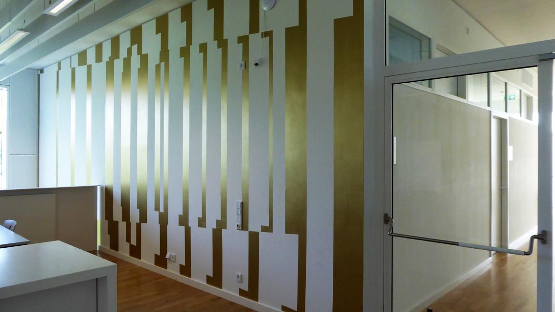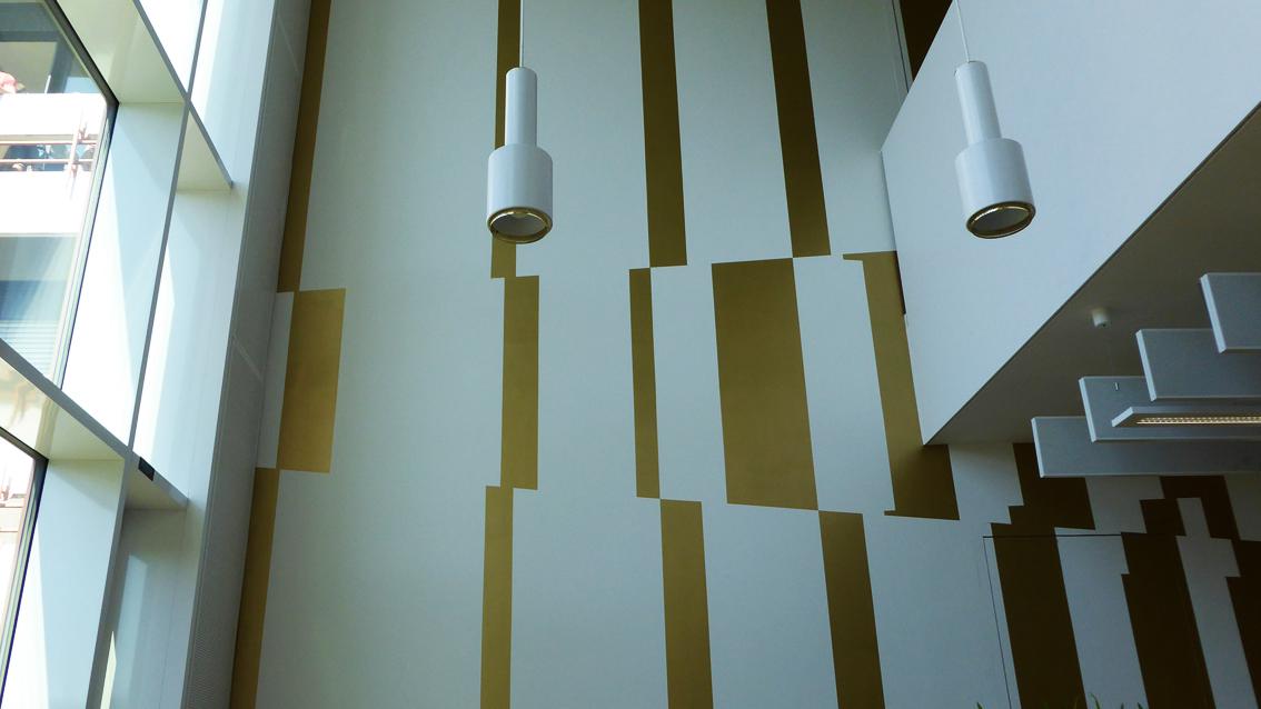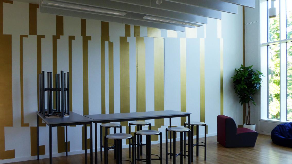 Der in Hamburg geborene Künstler studierte zwischen 1989 und 1994 an der Staatlichen Akademie der Bildenden Künste in Karlsruhe. Im Jahre 1995 wurde er Meisterschüler bei Prof. Erwin Gross. Bekannt ist Enrik Hüpeden für seine raum- und wandbezogenen Arbeiten. Seine Stockwerke übergreifende Wandmalerei antwortet auf die sachliche Architektur des neuen Anbaus der Walter-Eucken-Schule in einer Bildsprache mit Bezügen zur Op-Art der 60er Jahre des letzten Jahrhunderts. Durch klar konturierte Farbformen erzeugt der Künstler bei den Betrachtenden irritierende Effekte und die Illusion von Bewegung. In einem matt glänzenden Goldton ausgeführt, bezieht sich seine Formensprache unter anderem auf die aufgelöste Fassadenstruktur des Bestandbaus.