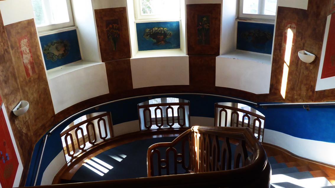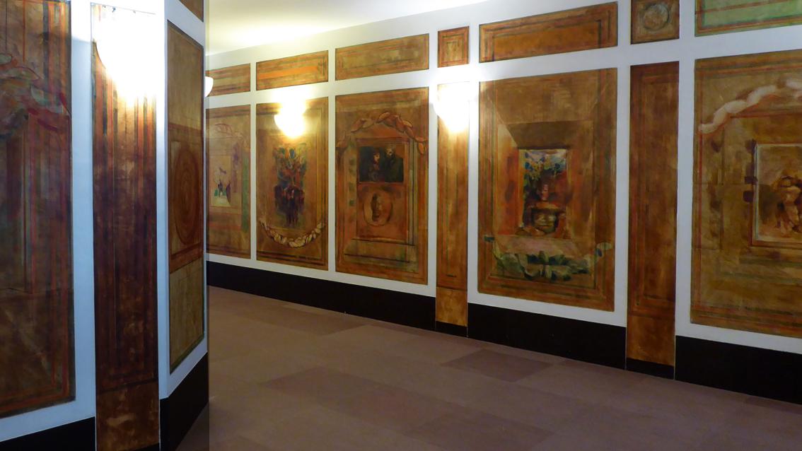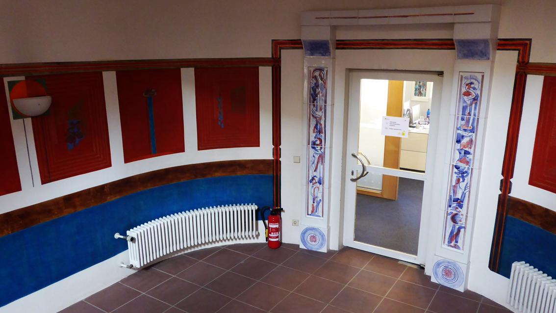 Ende des Jahres 1986 bezog nach umfassenden Umbauarbeiten die Führungsakademie des Landes Baden-Württemberg das Schwedenpalais gegenüber der Staatlichen Kunsthalle. Professor Klaus Arnold erhielt den Auftrag, das Foyer und das Treppenhaus künstlerisch zu gestalten. Das Konzept Arnolds sah vor, die Wände des Foyers und des Treppenhauses in verschieden große Felder zu unterteilen, die gegenständlich wie abstrakt ausgemalt werden sollten. So nehmen die Besucher*innen der Räumlichkeiten zugleich differenziert gemalte Figuren, Landschaften und Blumen als auch ungegenständliche Farbfelder mit zeichenhaften Formen wahr. Sämtliche Arbeiten wurden in einer von Arnold speziell für die Wandmalerei weiter entwickelten Enkaustik-Technik ausgeführt. Assistiert wurde der aus Heidelberg stammende Künstler von einigen seiner Meisterschüler*innen. Der Maler entwarf für die Führungsakademie zudem einige Türumrahmungen aus Keramikelementen, die von der Staatlichen Majolika Manufaktur Karlsruhe gefertigt und vor Ort installiert wurden. Klaus Arnold stand zwischen 1976 und 1988 der Staatlichen Akademie der Bildenden Künste Karlsruhe als Rektor vor. Unter seiner Leitung wurden international renommierte Künstler, wie Georg Baselitz oder Per Kirkeby als Professoren berufen. Der Künstler starb im Jahre 2009 in Karlsruhe.