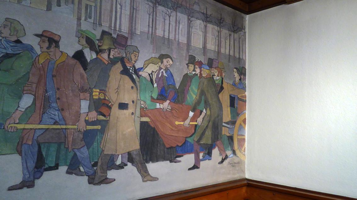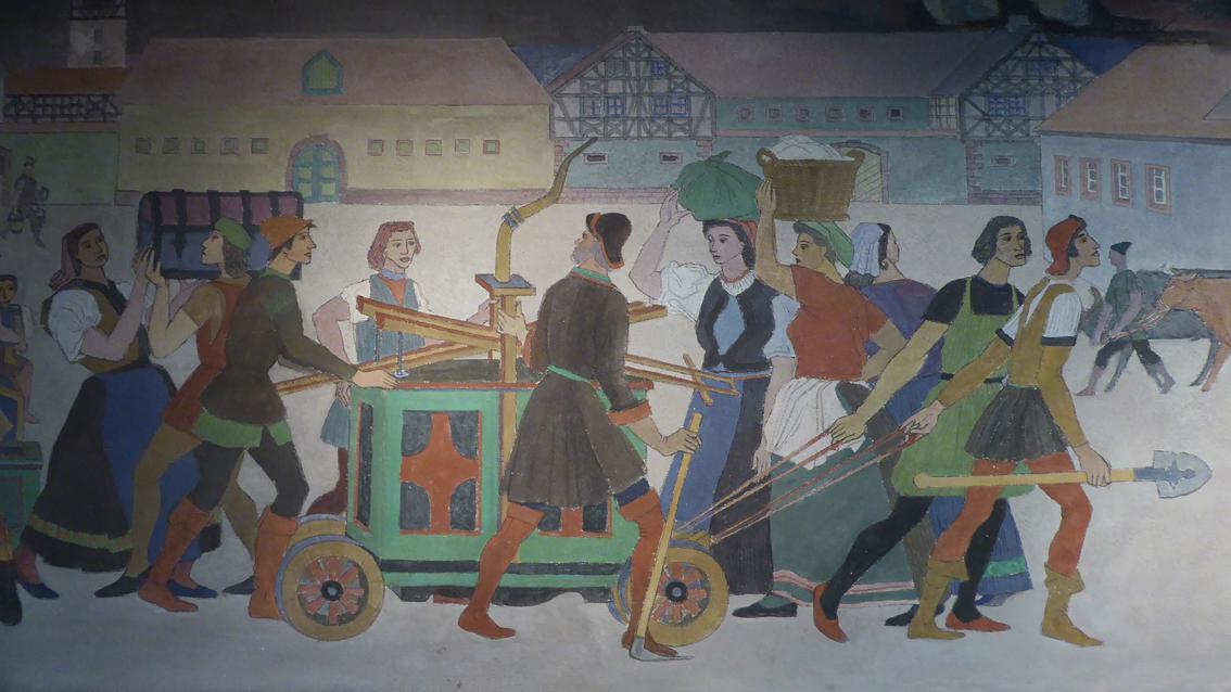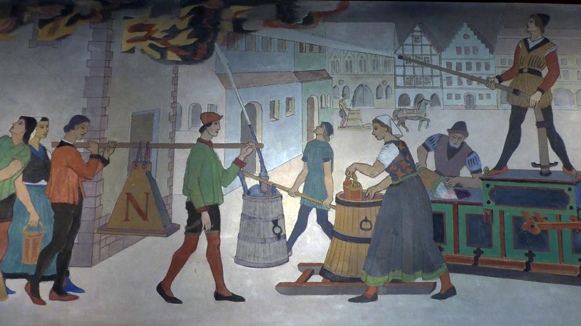 Ab 1938 studierte Dewald an die Badischen Landeskunstschule, einer Vorläufereinrichtung der Staatlichen Akademie der Bildenden Künste Karlsruhe. Während des Krieges hielt er sich als technischer Zeichner für das Militär in Paris auf. Dort kam er in Kontakt mit der Klassischen Moderne. Zwischen 1949 und 1989 führte Dewald zahlreiche öffentliche Aufträge in Form von Wand- und Glasmalereien, Bronzereliefs sowie Betonplastiken aus. Die Wandmalerei im Aufenthaltsraum der Freiwilligen Feuerwehr Karlsruhe Abt. Grötzingen entstand im Jahre 1957. Sie zeigt den Brand des Karlsruher Hoftheaters im Jahre 1847 und den couragierten Einsatz der ‚Freiwilligen Feuerwehr‘ aus Durlach in einer ca. 15 m breiten und ca. 130 cm hohen Bildfolge. Die Durlacher Feuerwehr wurde 1846 durch den Stadtbaumeister Christian Hengst und dem Spritzen-Fabrikanten Carl Metz gegründet.