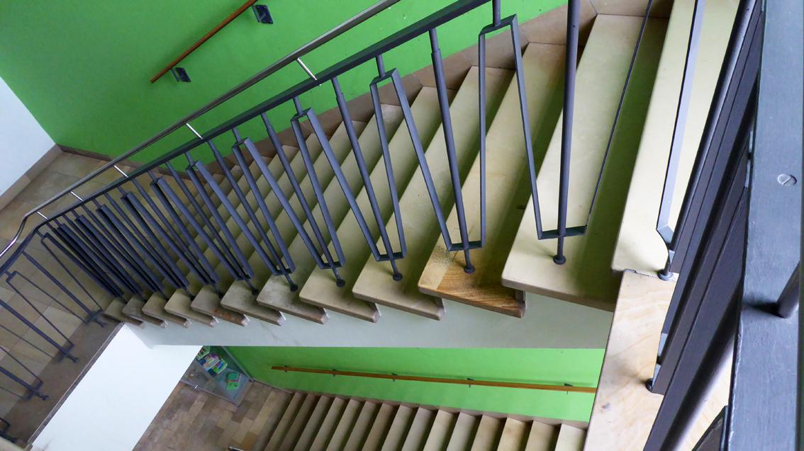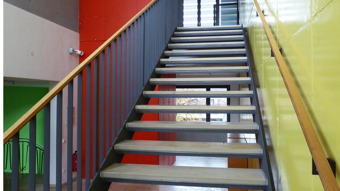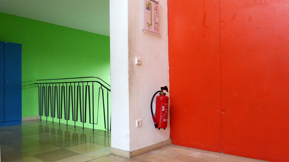Der Künstler wurde 1950 in Karlsruhe geboren und studierte in den 70er Jahren des letzten Jahrhunderts an der Staatlichen Akademie der Bildenden Künste Stuttgart. Er ist durch irritierende Fotokunst, farbstarke Interventionen im öffentlichen Raum und Kooperationen mit international renommierten Architekten weit über die Region hinaus bekannt. Funktionale Eigenschaften von Bauwerken betont Harald F. Müller durch subtile, farbige Eingriffe. Im Treppenhaus des Anbaus des Helmholtz-Gymnasiums sind die bestimmenden Farben Rot, Gelb und Grün. Sie sind so untereinander und mit der Architektur in Beziehung gesetzt, dass die Passierenden stetig sich wandelnde Räume unterschiedlicher Farbintensität durchschreiten. Die blauen Spinte, die abgestellten Gegenstände und der sandfarbene Sockel, werden in Verbindung mit den künstlerischen Farbsetzungen zu selbstverständlichen Bestandteilen einer umfassenden Inszenierung von Raum mit Farbe.