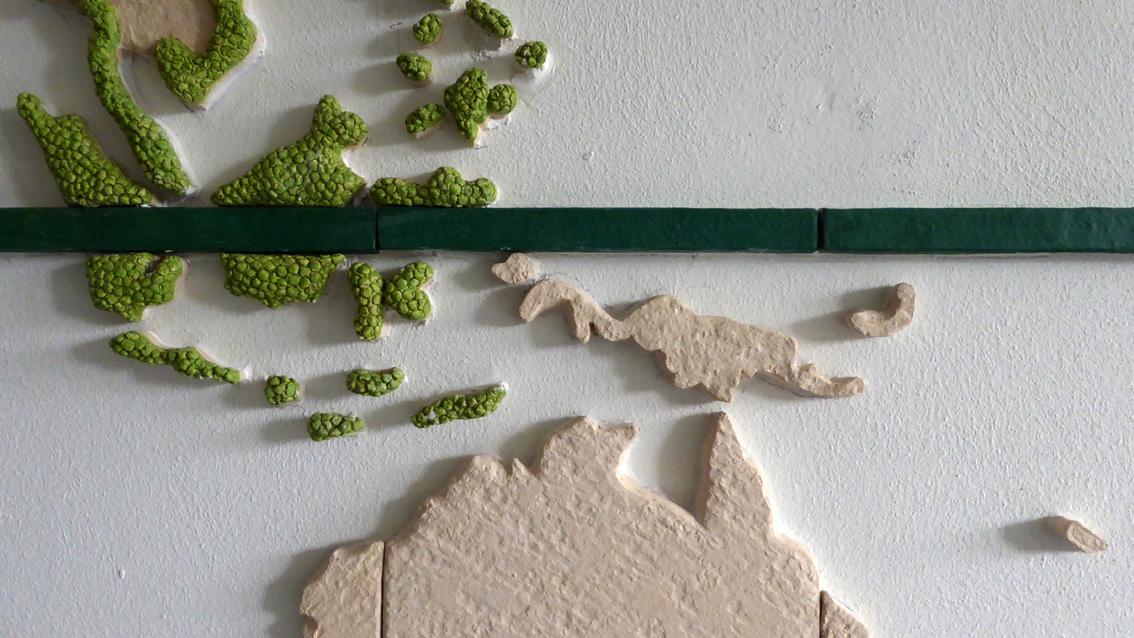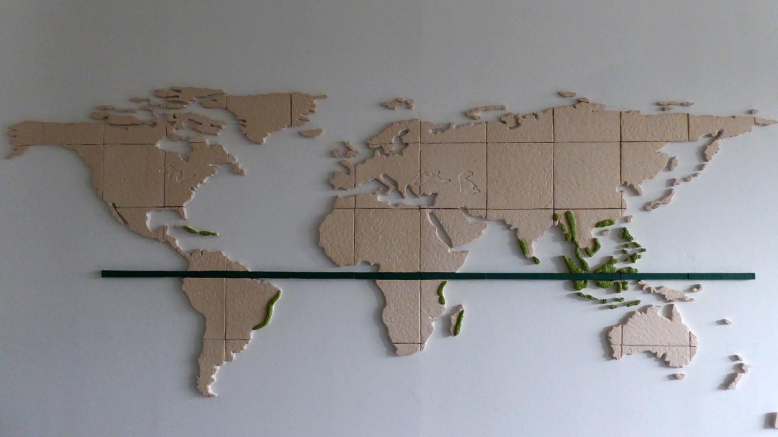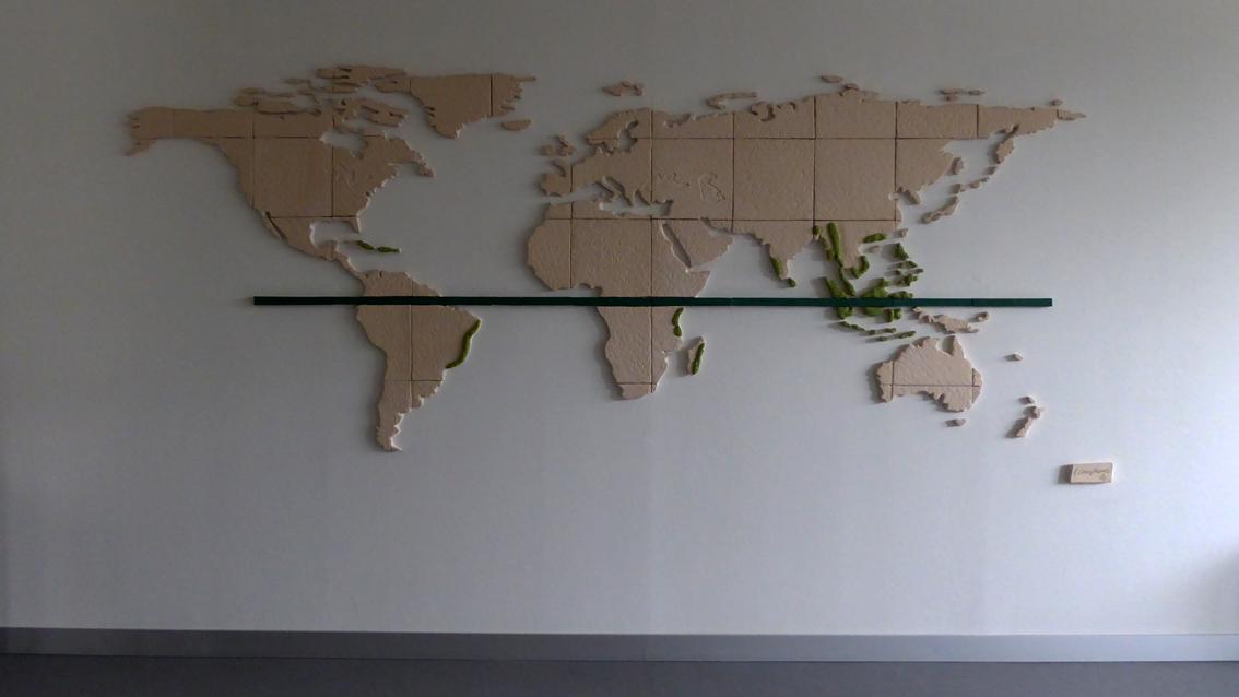 Hannelore Langhans installierte ihre ‚Weltkarte‘ vor dem Vortragssaal des Zoologischen Stadtgartens, der sich im Obergeschoss des Exotenhauses befindet. Im Gegensatz zur ‚Weltkarte‘ von Carl Egler im Elefantenhaus, ist die Arbeit der Karlsruher Keramikerin eher sachlich konzipiert und ausgeführt. Statt gegenständlicher Ergänzungen - wie bei Egler die Elefantenhochreliefs - durchzieht eine dunkelgrüne, flache Äquatorlinie die in Ocker wiedergegebene Erde auf Augenhöhe. Hervorhebungen in Hellgrün beleben die Weltscheibe dort, wo sich der tropische Regenwald befindet. Das Werk entstand in Zusammenarbeit mit der Staatlichen Majolika Manufaktur Karlsruhe, mit der Hannelore Langhans seit langem eng zusammenarbeitet.