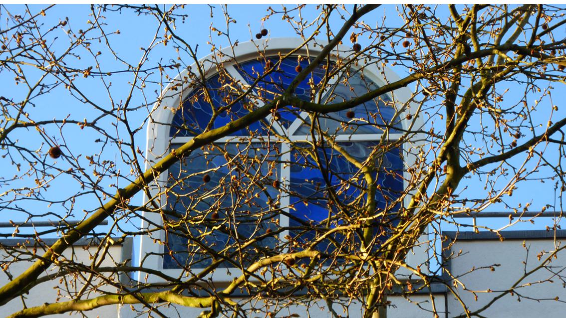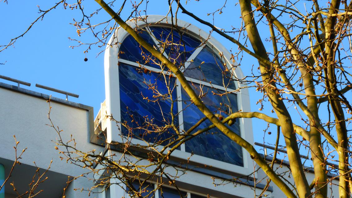 Das Künstlerpaar Barbara Jäger und OMI Riesterer entwarf und verwirklichte zwischen 1983 und 1986 zwei Blendfenster, die einen Wohnblock in der Mathystraße bekrönen. In einem additiven Verfahren sind Glasfragmente aus mehr Blau- und weniger Rottönen zu einer auf den ersten Blick ungegenständlichen Komposition gefügt. Beim genauen Hinsehen lassen Farbe, Form und Zuordnung der Gläser an Gefieder von Vögeln, an Schuppen von Fischen oder an kleine Wellen denken. Barbara Jäger studierte von 1966 bis 1970 an der Staatlichen Akademie der Bildenden Künste Karlsruhe, OMI Riesterer absolvierte von 1968 bis 1977 ein Architekturstudium an der damaligen Technischen Hochschule Karlsruhe (heute KIT). Die beiden arbeiten seit 1970 zusammen.