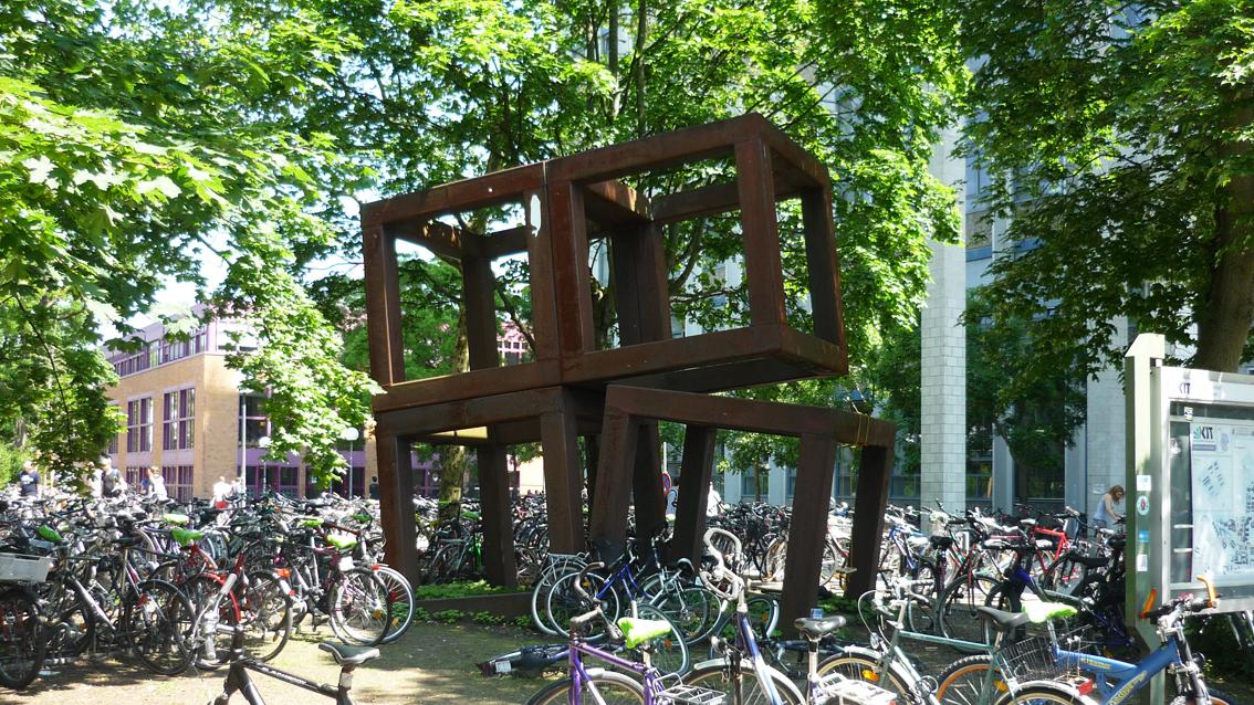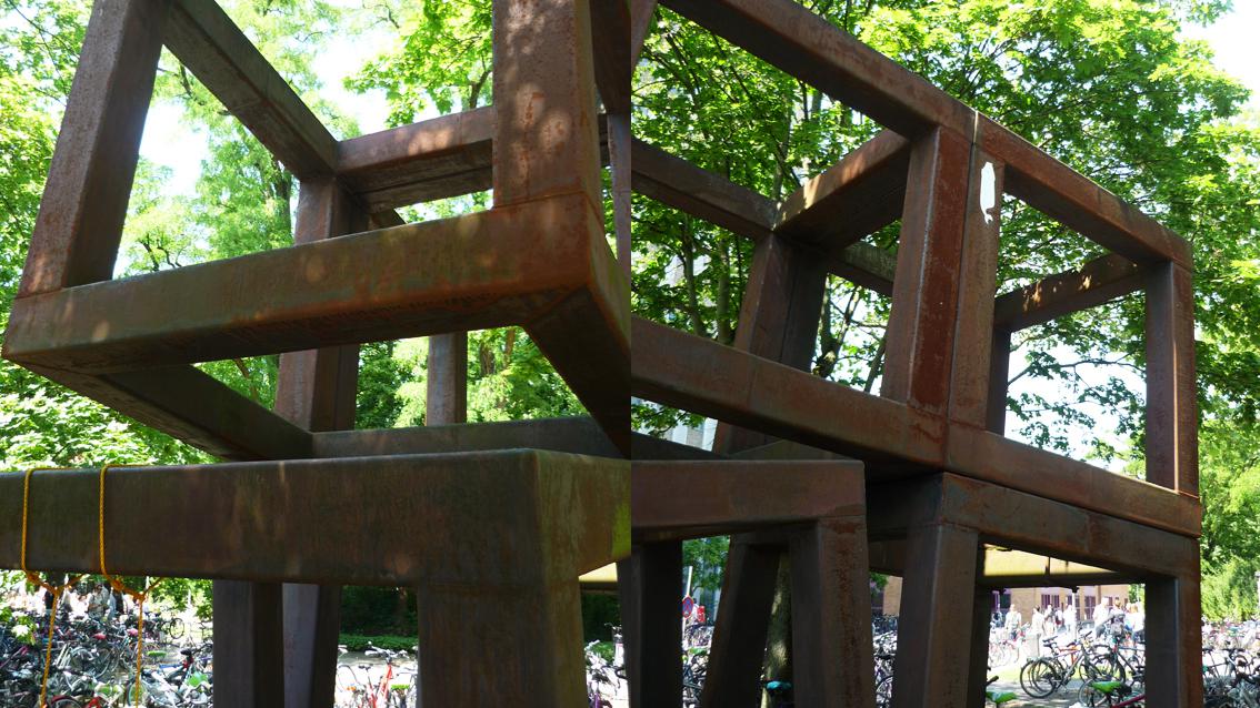 Die Stahlskulptur besteht aus offenen Würfelelementen, die in der Addition eine vierteilige Gitterkonstruktion ergeben. Eine Form ist losgelöst, wodurch eine Störung der Gesamtansicht erfolgt. Das Werk steht in der Tradition minimalistischer Tendenzen in der Kunst der 60er Jahre des letzten Jahrhunderts, wie sie z.B. der amerikanische Künstler Sol LeWitt vertritt, der ebenfalls in Karlsruhe mit einer repräsentativen Arbeit vertreten ist.