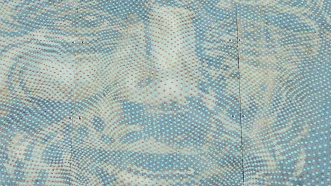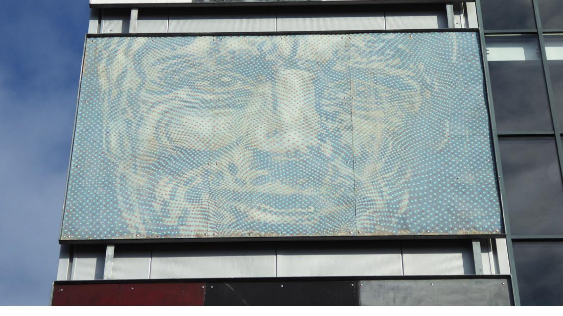 Der Maler ist Mitglied des Künstler*innenvereins ‚PlakatWandKunst‘. Seit Jahren ist diese Gruppe in der Stadt Karlsruhe, in der Region und darüber hinaus mit temporären Aktionen im öffentlichen Raum aktiv. Verbindendes Konzept ist, dass die individuellen, künstlerischen Ideen auf Holzplatten und in dem Format 260 cm auf 360 cm verwirklicht werden. Die Träger der Raumfabrik haben Werke einzelner Künstler*innen der Gruppe in den vergangenen Jahren erworben und an verschiedenen Stellen der Gebäude des Anwesens fest installiert. Der Karlsruher Maler Andreas Lau ist über die Region hinaus für seine besondere Maltechnik bekannt. Dabei setzt er Punkte verwandter Farben so neben- und übereinander, dass vielfach ein deutlich erkennbares, naturalistisches Abbild entsteht. Bei der Arbeit ‚Anonym-Bildstörung‘ scheint der Bildgegenstand eine ihm unbekannte Person zu sein. Andrea Lau wurde 1964 geboren, von 1984 bis 1994 studierte er an der Staatlichen Akademie der Bildenden Künste in Karlsruhe bei Prof. Gerd van Dülmen. Er verstarb im Jahre 2024.
