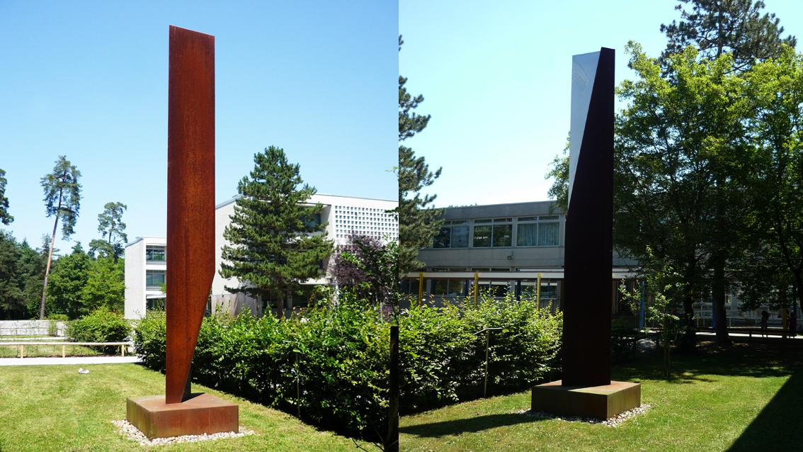 Die Plastik der Karlsruher Künstlerin thematisiert in einer einfachen und elementaren Formensprache, die in der Tradition des Minimalismus steht, Prozesse des Aufbrechens: Die planen Flächen entfalten bzw. verjüngen sich in vertikaler Ausrichtung und bilden so ein zeichenhaftes Kunstwerk. Die Stahl- und Edelstahlflächen stehen für verschiedene Erscheinungsformen verwandten Materials und reagieren unterschiedlich auf Bewitterung sowie den Wechsel des Tageslichts.