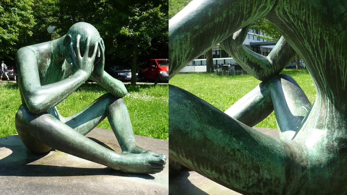 In sich versunken und unbekleidet, ruht der bronzene Denker des Berliner Bildhauers und Träger des Georg-Kolbe-Preises bodennah auf einer einfachen Plinthe. Deutlich sind in Inhalt und Form die 60er Jahre des letzten Jahrhunderts gegenwärtig. Die Formensprache ist gegenständlich mit einer Tendenz zur Vereinfachung. Die Konzentration auf das Wesentliche und der symmetrische Aufbau verleihen der Plastik einen zeichenhaften Charakter.