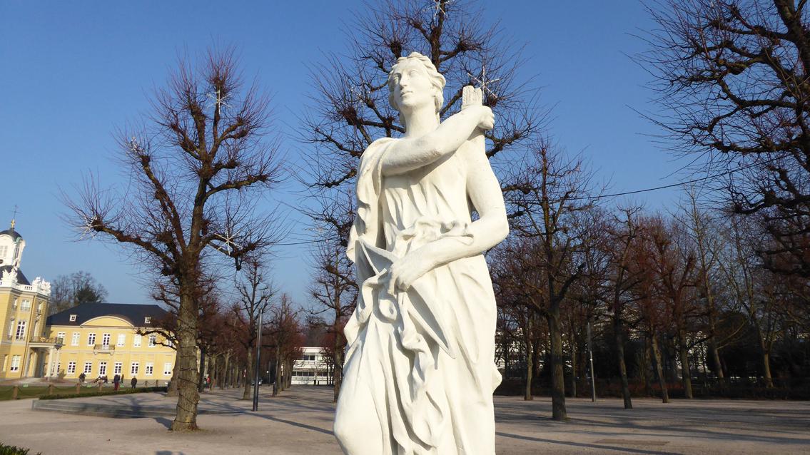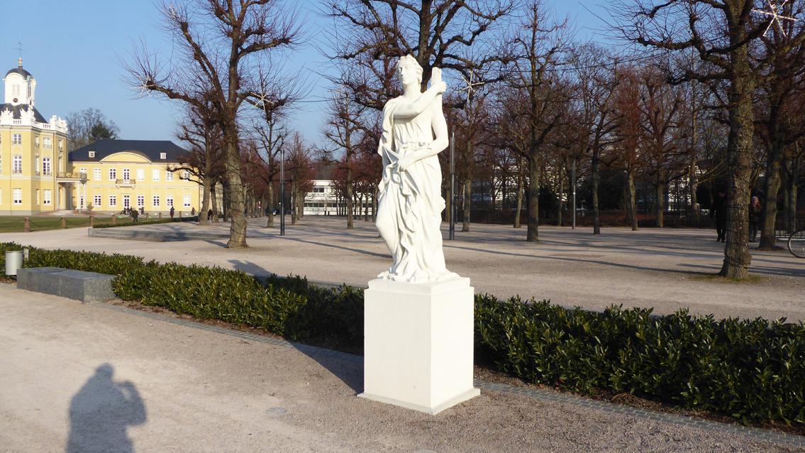 Der Künstler Emil Sutor, der in Karlsruhe mehrfach vertreten ist, deutete die ursprünglich von Ignaz Lengelacher entworfene Diana neu und fertigte sie im wetterbeständigen Betongussverfahren. Diana ist in der römischen Mythologie die Göttin der Jagd, des Mondes und der Geburt. Sie ist die Beschützerin der Frauen und Mädchen. Sie entspricht der Artemis in der griechischen Mythologie. Anlässlich der Bundesgartenschau wurde die Plastik im Jahre 1967 an der Ostseite des Schlossplatzes aufgestellt.