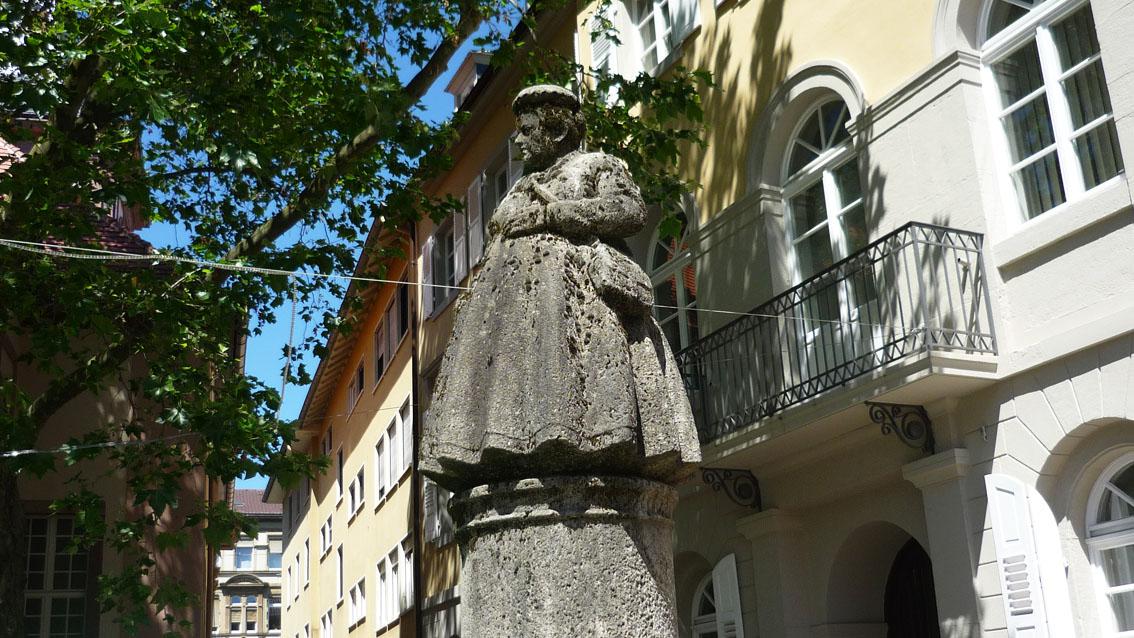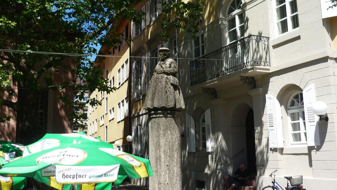 Auf einem ländlich anmutenden Platz, direkt hinter der Kleinen Kirche ist die ‚Marktfrau‘ des Bildhauers und Absolventen einer Bildhauerklasse der Badischen Landeskunstschule, aus der ab 1961 die Staatliche Akademie der Bildenden Künste Karlsruhe wurde, auf einem Pfeiler aufgestellt. Leicht erhöht, betrachtet sie seit Jahrzehnten mit großer Gelassenheit das städtische Treiben aus der Perspektive der einfachen Landfrau.