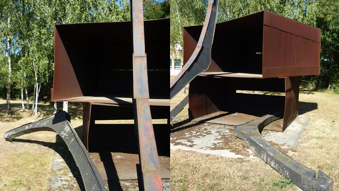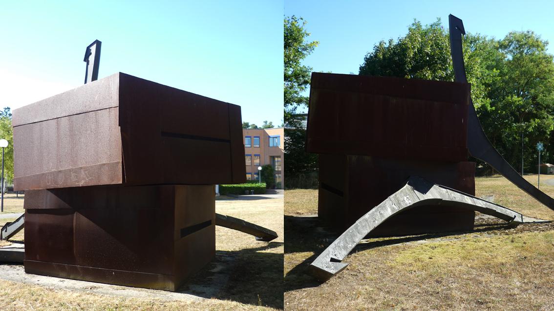 Zur Zeit der Installierung dieses Kunstwerks war das zugeordnete Gebäude das Kreiswehrersatzamt, ein Ort an dem damals unter anderem junge Männer gemustert wurden. Die Arbeit von Elisabeth Wagner, die an der Staatlichen Akademie der Bildenden Künste Karlsruhe bei Wilhelm Loth studierte, verweist mit Titel und Ausstattung auf diesen Umstand. ‚Einzug' heißt das Werk und es besteht aus spintähnlichen, einfachen Kästen, denen übergroße Kleiderbügel zugeordnet sind. Das verwendete Material ist Cortenstahl, eine Stahlvariante, die nach Anrostung eine witterungsbeständige, rotbraune Patina bildet.