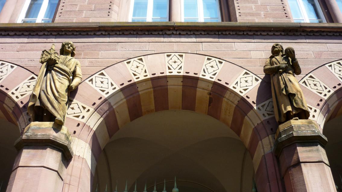 Über dem Eingangstor zur ehemals Technischen Hochschule Karlsruhe, heute KIT, Zugang Kaiserstraße, befinden sich zwei Portalstatuen. Dargestellt sind links Erwin von Steinbach, Erbauer des Straßburger Münsters und rechts das Universalgenie Johannes Kepler. Der eine repräsentiert die (Bau)Kunst, der andere die Naturwissenschaften. Über Zuordnungen sind die dargestellten Persönlichkeiten identifizierbar.