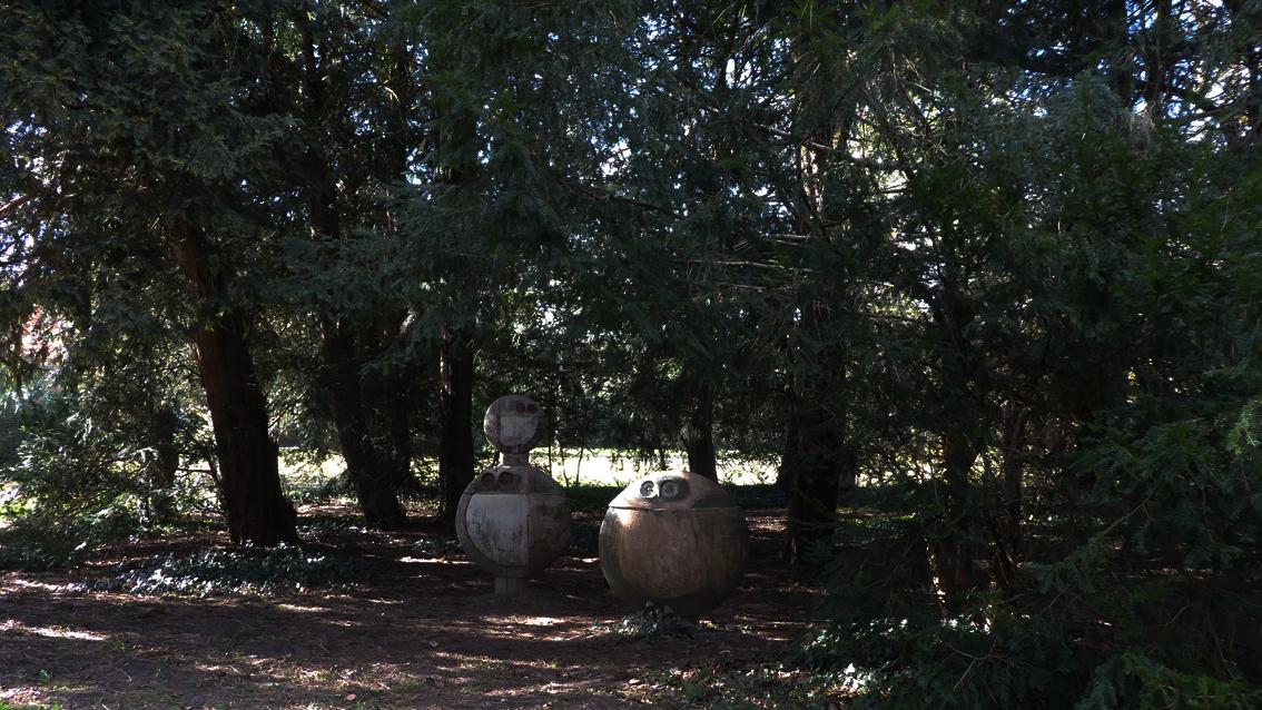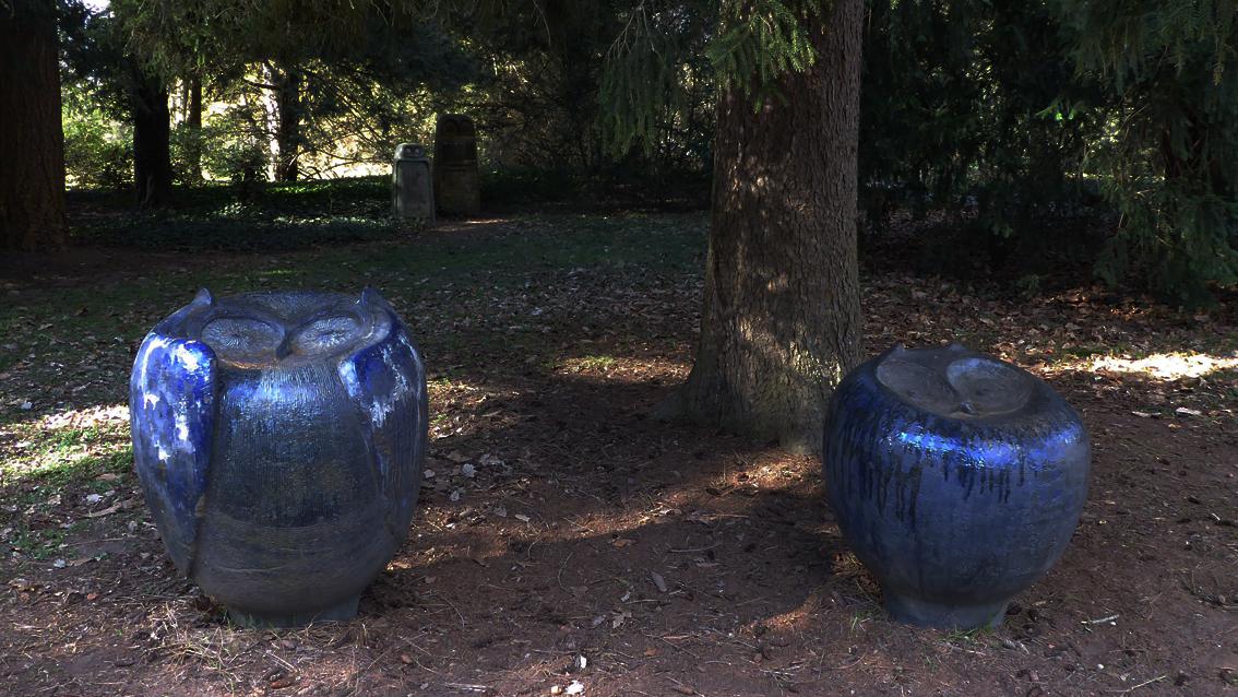 Das plastische Ensemble von Eva Fritz-Lindner besteht aus acht Eulen unterschiedlicher Höhe, Breite und Tiefe, verteilt über eine Rasenfläche nahe dem Botanischen Garten. Mit unterschiedlichen Ausdrucksformen und in einer eher zurückgenommenen, naturnahen Farbigkeit treten die Eulen in Kontakt mit den vorbei Flanierenden. Die Gruppe wurde anlässlich der Bundesgartenschau im Jahre 1967 im Schlosspark aufgestellt. Über Jahre arbeitete die Keramikerin eng mit der Staatlichen Majolika Manufaktur Karlsruhe zusammen. Eva Fritz-Lindner wurde am 17.März 1933 in Düsseldorf geboren und studierte an den Werkkunstschulen Wiesbaden und Darmstadt. Sie verstarb am 2.Juli 2017 in Karlsruhe.