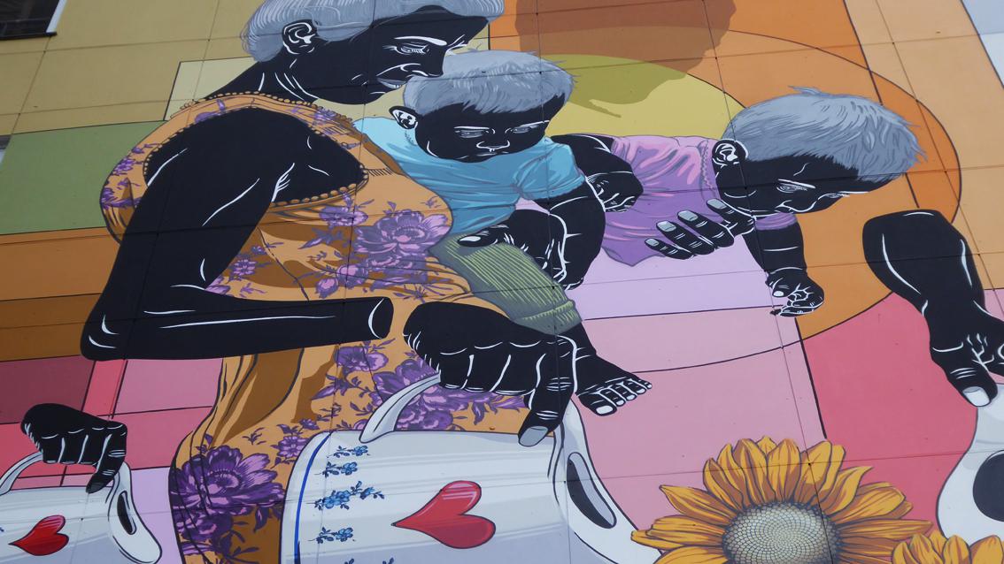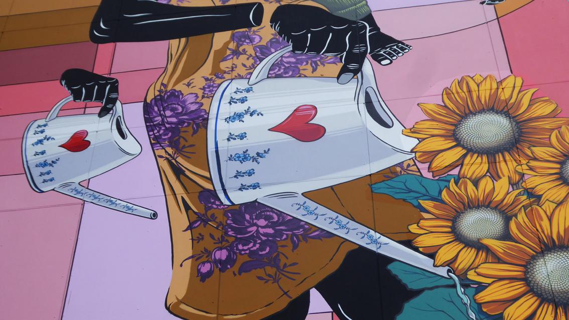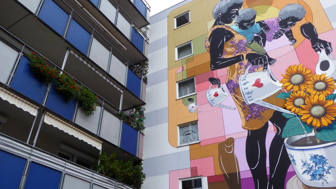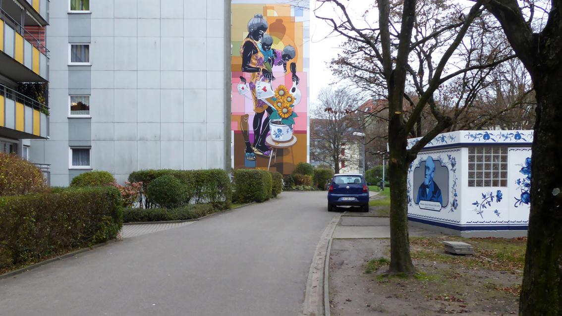 „Es soll eine Alltagsgeschichte erzählen und eine Situation zeigen, was Menschen daheim tätigen“ so der Streetart Künstler Dome über sein monumentales Fassadenbild in der Karlsruher Südstadt. Im 17. Jahrhundert begannen niederländische Maler wie Pieter de Hooch oder Vermeer, Menschen bei einfachen Handlungen darzustellen, allerdings im kleinen Format. Durch Vincent van Gogh errang das Sonnenblumenmotiv Kultstatus. So steht Dome alias Christian Krämer mit seinem Wandgemälde in der Tradition berühmter künstlerischer Positionen. Neu ist die extreme Vergrößerung des Motivs, die Schwarzeinfärbung seiner Protagonisten, sowie die Verdoppelung des Kindes, des Beins der Frau und der Gießkanne mit Herzmotiv. Schön der Moment, wenn von realen Menschen die benachbarten Balkonpflanzen gegossen werden: Dann entsteht ein Gegensatz der besonderen Art zwischen selbstverständlichem Realismus und monumentalem Illusionismus.