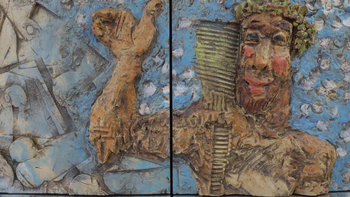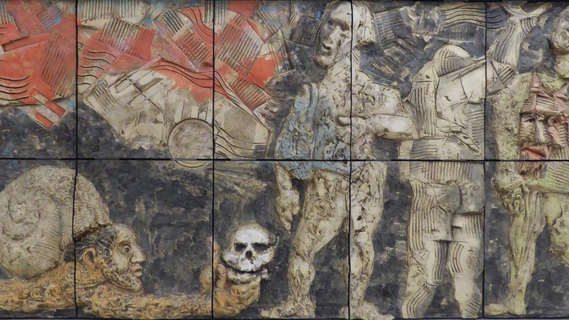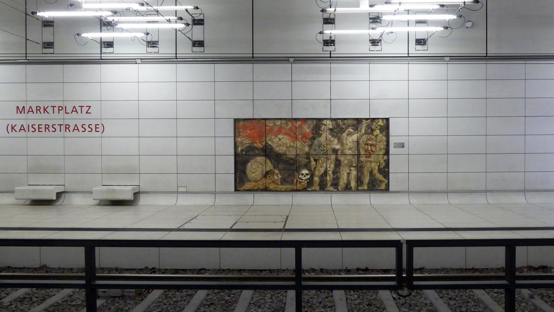 Markus Lüpertz entwarf und verwirklichte für sieben U-Bahn Stationen vierzehn monumentale Wandbilder aus Ton. Ein Relief wurde in der Karlsruher Majolika und die weiteren in der Zeller Keramik-Manufaktur hergestellt. Alle Werke sind zwei Mal gebrannt (Sprüh- und Glasurbrand). Keramik gilt als ein sehr haltbares, witterungsbeständiges Material und ist deshalb für den öffentlichen Raum gut geeignet. Initiiert und finanziert wurde das Projekt von dem Verein ‚Karlsruhe Kunst Erfahren e.V.‘. Entstanden ist eine subjektive Deutung der Schöpfungsgeschichte in Form farbig gefasster Hochreliefs. Diese sind in einer Bildsprache ausgeführt, welche die Wirklichkeit expressiv abstrahiert und surreal überhöht. Sämtliche Keramikbilder werden für 7 Jahre der Stadt Karlsruhe als Leihgabe des Vereins ‚Karlsruhe Kunst Erfahren e.V.‘ überlassen. - ‚Von schönster Gestalt‘ bezieht sich auf die tragische Liebesgeschichte zwischen Orpheus und Eurydike. Die Götter erlauben Orpheus Eurydike aus dem Hades zurück in die Welt zu holen, vorausgesetzt er dreht sich nicht nach ihr um. Wie das Bild zeigt, hält er sich nicht daran. Begleitet vom Klirren des zerbrochenen Spiegels zur Welt, verliert er endgültig seine Geliebte. Die Arbeit ‚Die Königswürde’ zeigt links einen ‚Schneckenmann‘ mit Totenschädel unter rot gefassten Formen, die an Feuer erinnern. Rechts sind zwei Figuren von vorne und eine von hinten dargestellt. Auf dem Oberteil der Person am rechten Bildrand ist ein Kopf mit zwei Hörnern zu sehen. - Markus Lüpertz wurde am 25. April 1941 in Reichenberg geboren. Zwischen 1973 und 1986 lehrte er an der Staatlichen Akademie der Bildenden Künste in Karlsruhe. Von 1988 bis 2009 war er Rektor an der Kunstakademie Düsseldorf. Lüpertz ist in erster Linie Maler, allerdings entstehen seit etwa 1980 immer wieder plastische Arbeiten.