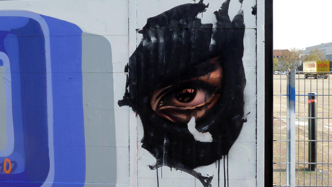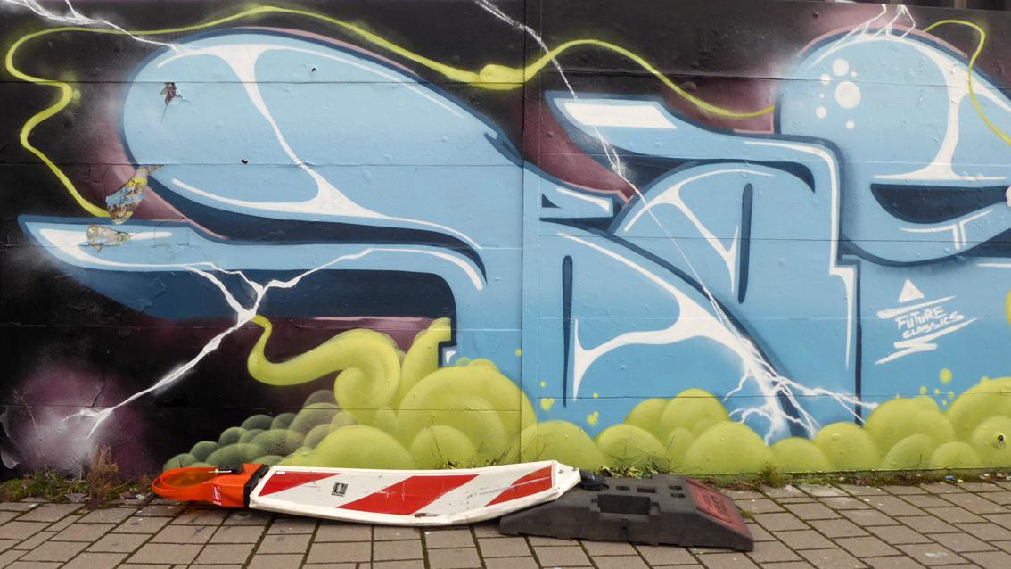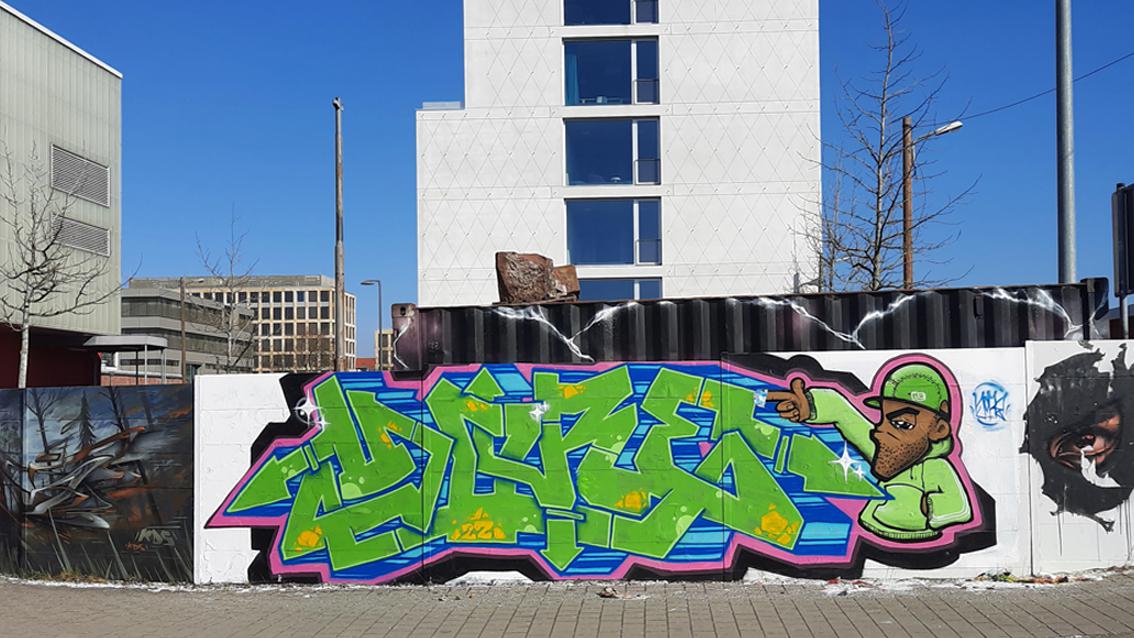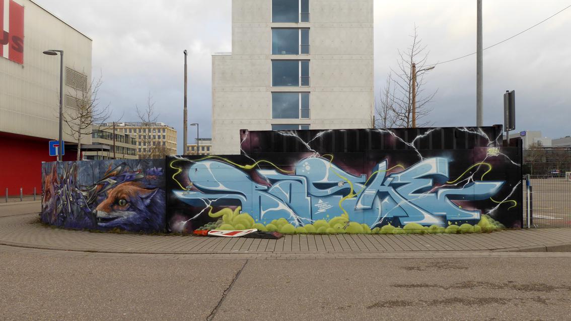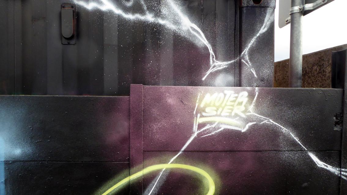 Moter und Sier sind Mitglieder des ‚Combo‘ – HipHop Zentrums Karlsruhe, das im Jahre 2005 gegründet wurde. In der Fassung von Anfang 2021 'grüßt' ein anonymer Sprayer die beiden, was in der Szene so üblich ist. Aus einem organisch gestalteten Bodenstreifen erheben sich dreidimensional erscheinende Zeichen. Feine Bewegungsspuren gelben und weißen Sprühfilms binden den hinter der Mauer liegenden Container mit ein und vernetzen die verschiedenen Gestaltungzonen untereinander...In regelmäßigen Abständen wird die Wand neu gestaltet, in der Regel von den gleichen Graffitikünstlern.