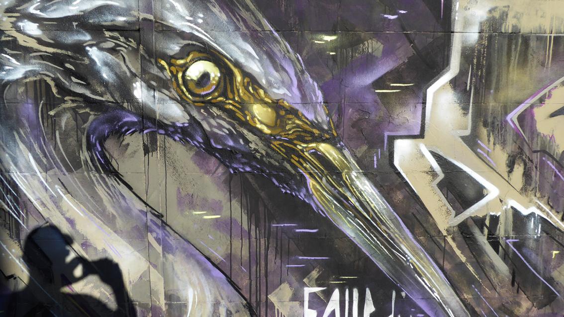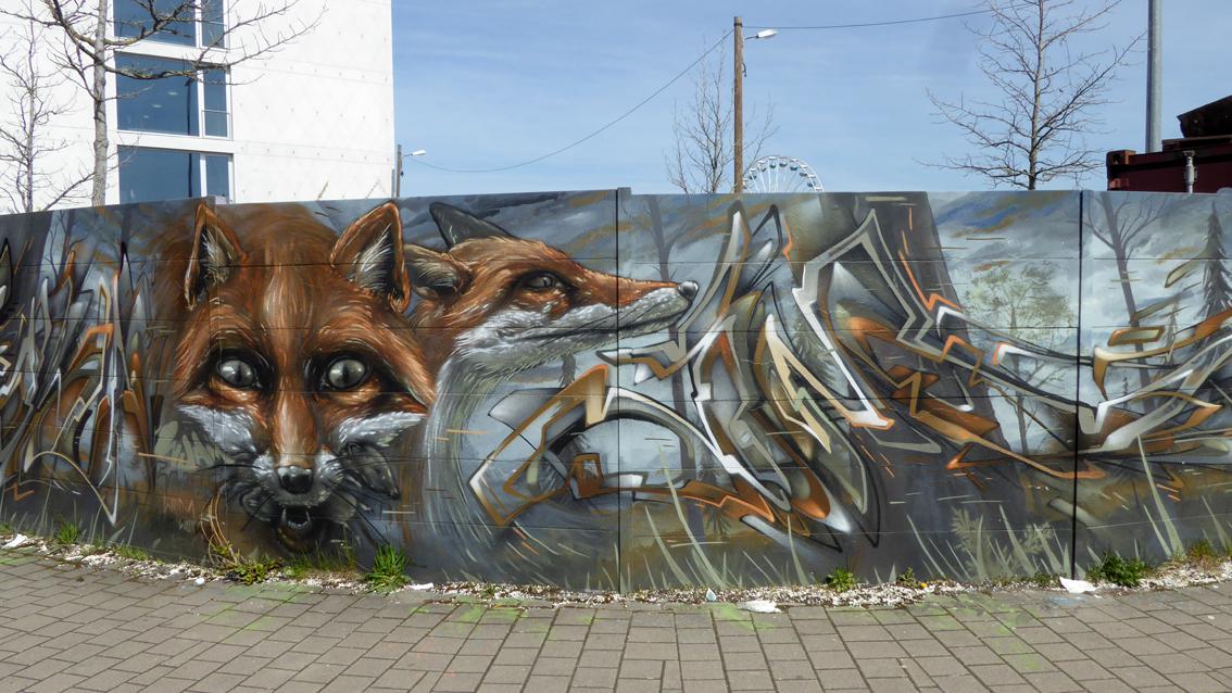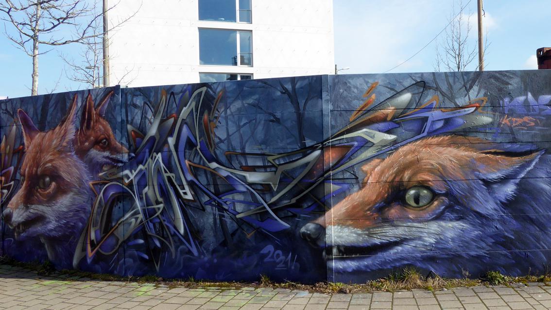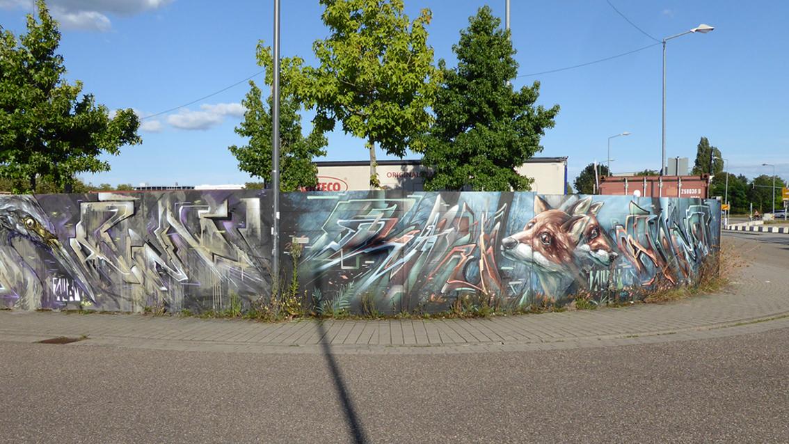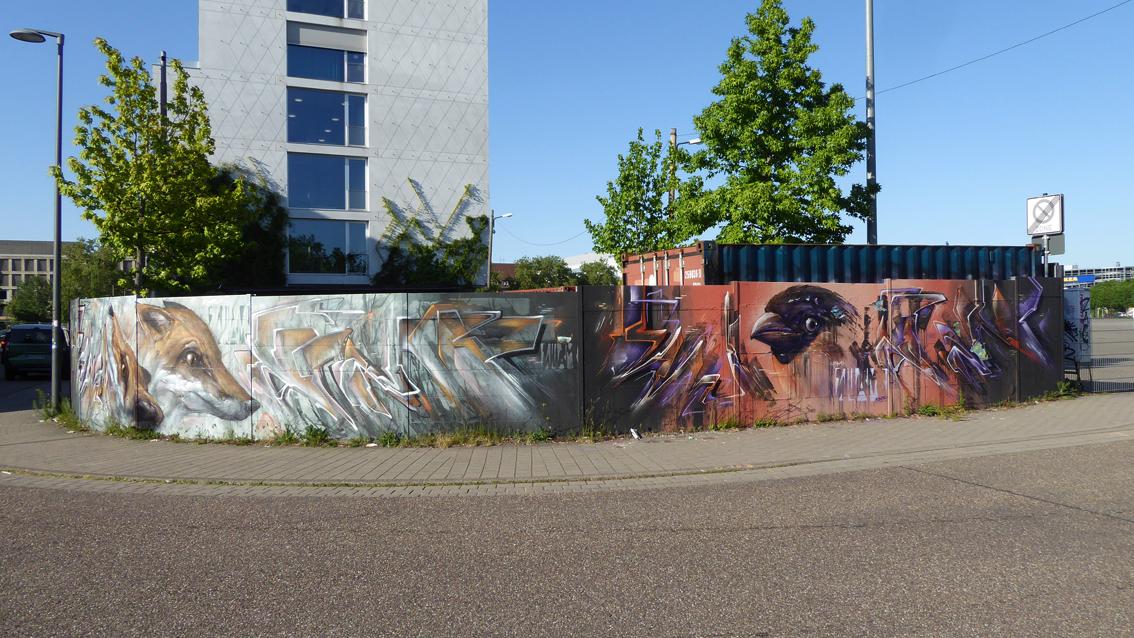 Auf einer ca. 175 cm hohen und 10 Meter breiten, gebogenen Wandfläche an der südwestlichen Außenmauer des Messplatzes, befindet sich seit 2017 ein Graffiti des Karlsruher Street Art Künstlers Sven R., der sich auch WUAM (WorldNeedColors) nennt. Im Mittelpunkt der Arbeit mit extremem Querformat stehen unterschiedliche Ansichten eines Stadtfuchses. In den letzten Jahren wurde die Wandmalerei mehrfach umgearbeitet.