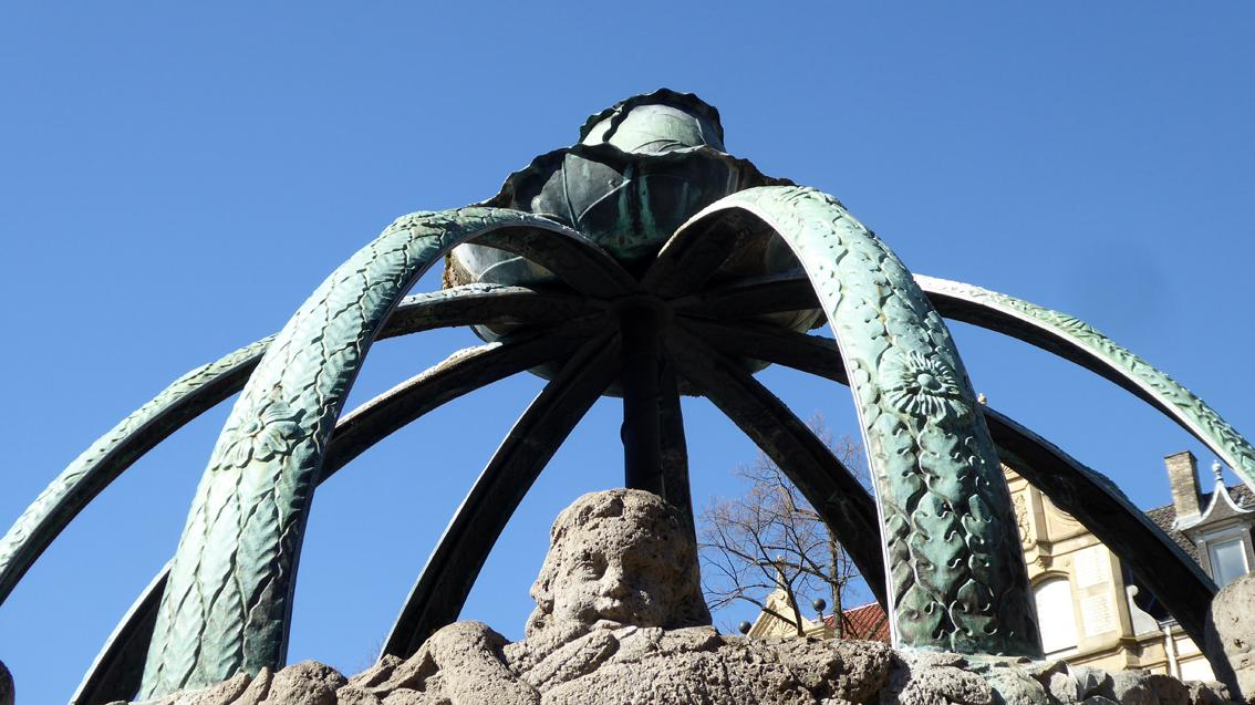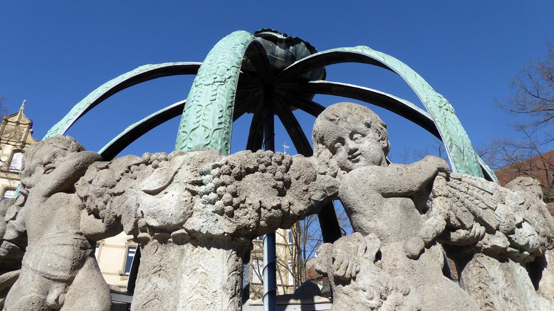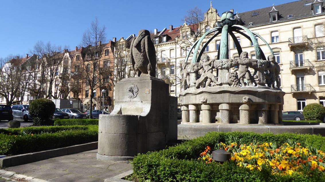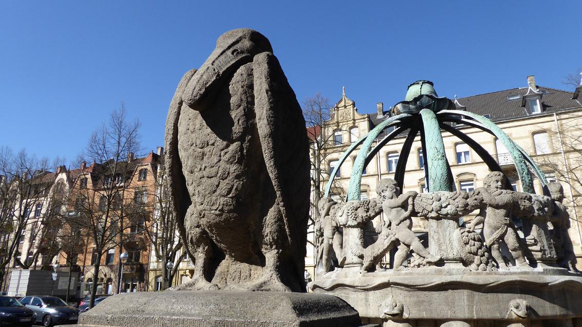 Wegen des Kohls am bekrönenden, oberen Abschluss heißt der Hauptbrunnen im Volksmund auch ‚Krautkopfbrunnen‘. 1905 erhielt der Architekt und Hochschullehrer Friedrich Ratzel von der Stadt Karlsruhe den Auftrag, für den Gutenbergplatz einen Brunnen zu entwerfen. Erst nach Ratzels Freitod (1907) ist die Anlage im Jahre 1908 der Bevölkerung der Weststadt übergeben worden. Im 2.Weltkrieg wurden Rippen und Krautkopf für die Rüstungsindustrie eingeschmolzen. Dank bürgerschaftlichem Engagements konnten die fehlenden Teile zwischen 1960 und 1962 rekonstruiert werden. Am 5. August 1962 feierte man die Wiedereinweihung des beliebten Brunnens. Neben dem Krautkopfbrunnen befindet sich der ebenfalls von Ratzel 1905 entworfene Pelikanbrunnen aus Stein, der in Ergänzung der Gesamtanlage die Besucher*innen des Gutenbergplatzes mit Trinkwasser versorgt.