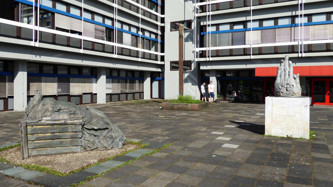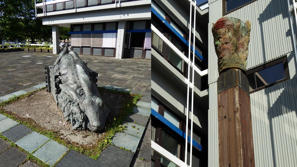 Der ‚Feldhase‘ ist die bekannteste Naturstudie, die ‚Betenden Hände’ das am häufigsten reproduzierte Werk, das ‚Rasenstück‘ das berühmteste Stillleben Dürers. Jochen Goertz, der an der Staatlichen Akademie der Bildenden Künste in Karlsruhe ausgebildet wurde, gestaltete auf der Grundlage der drei Vorbilder zwischen 1978 (Entwurf) und 1980 (Aufstellung) eine rätselhafte, plastische Installation. Bei seinem Kunstwerk ranken die Finger der Hände gekrümmt nach oben, ruht der Hase gelangweilt vor seiner Kiste und wächst ein streichholzähnliches Gebilde mit einem Kopf aus Kunststoff in einem Wildwuchsbeet gegen den Himmel über dem Steinbuch Centre for Computing am KIT, vor dem sich die plastische Gruppe befindet.