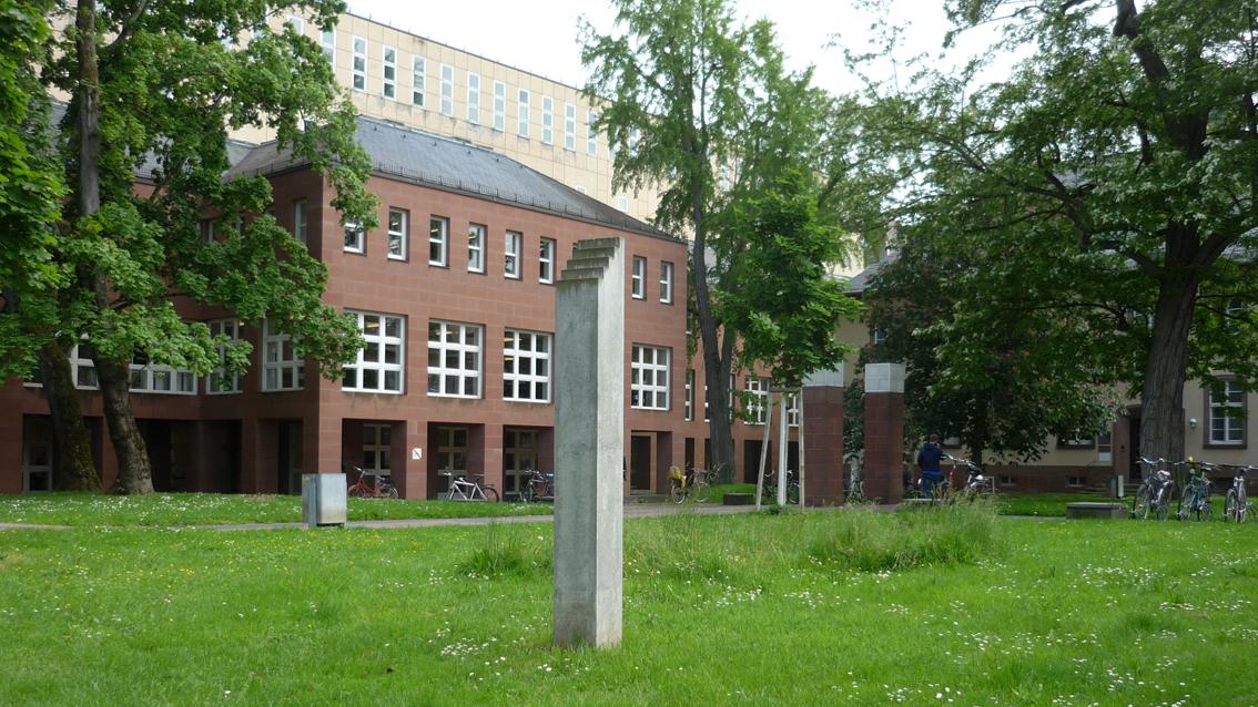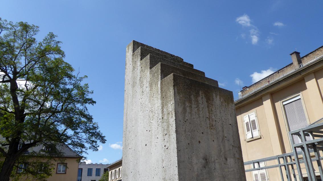 Die Hohe Treppe des Künstlers, der an der Düsseldorfer Kunstakademie lehrte, befindet sich im Innenhof der Badischen Landesbibliothek. Bekannt wurde der Bildhauer in den 80er Jahren des letzten Jahrhunderts mit elementaren Betonskulpturen von suggestiver Symbolkraft. Die Karlsruher Arbeit ist dafür ein repräsentatives Beispiel. In einer einfachen Formensprache wird der Blick entlang des Betonpfeilers zu einer fünfstufigen Treppe geleitet, die im Nichts endet.