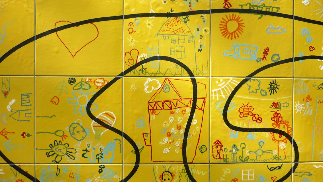 Das Kachelbild befindet sich an einer Außenwand des Albschulkindergartens. Der Karlsruher Künstler führte es in einer einfachen Bildsprache aus. Jede einzelne Kachel ist individuell unter Einbeziehung der Kindergartenkinder gestaltet, ein monumentales Fabelwesen verbindet als Linienzeichnung die Kacheln untereinander. Die Gesamtarbeit ist von einem warmen und lichten Gelb bestimmt.