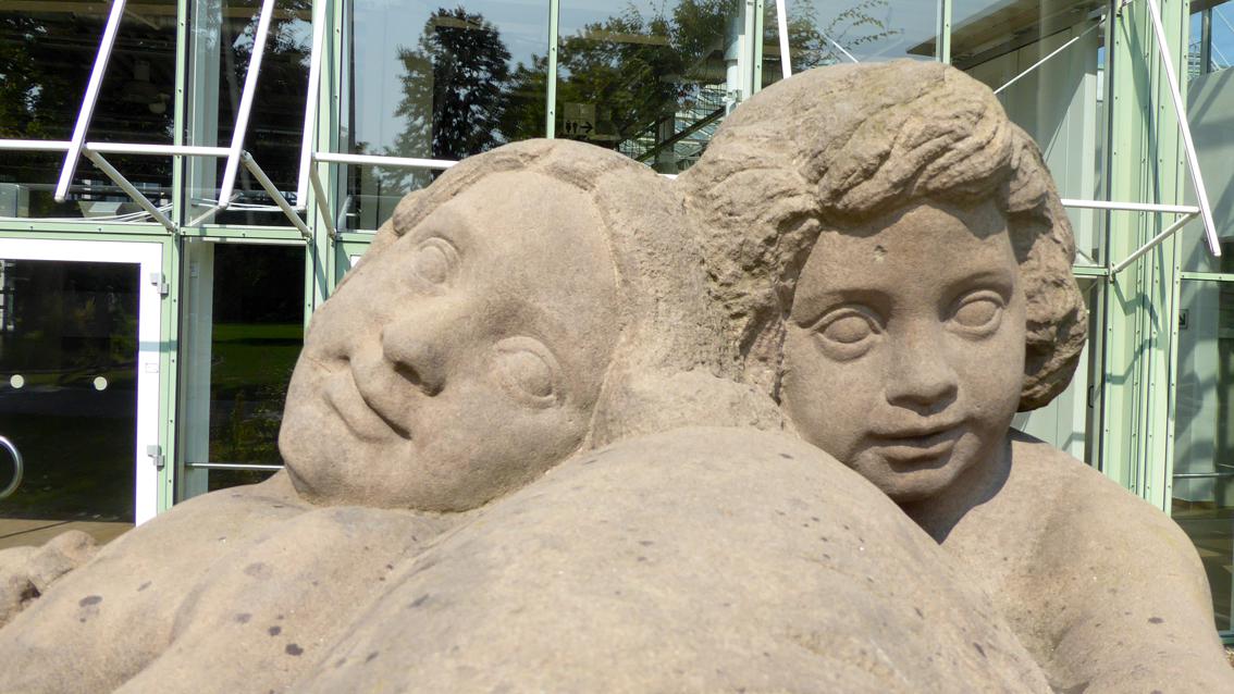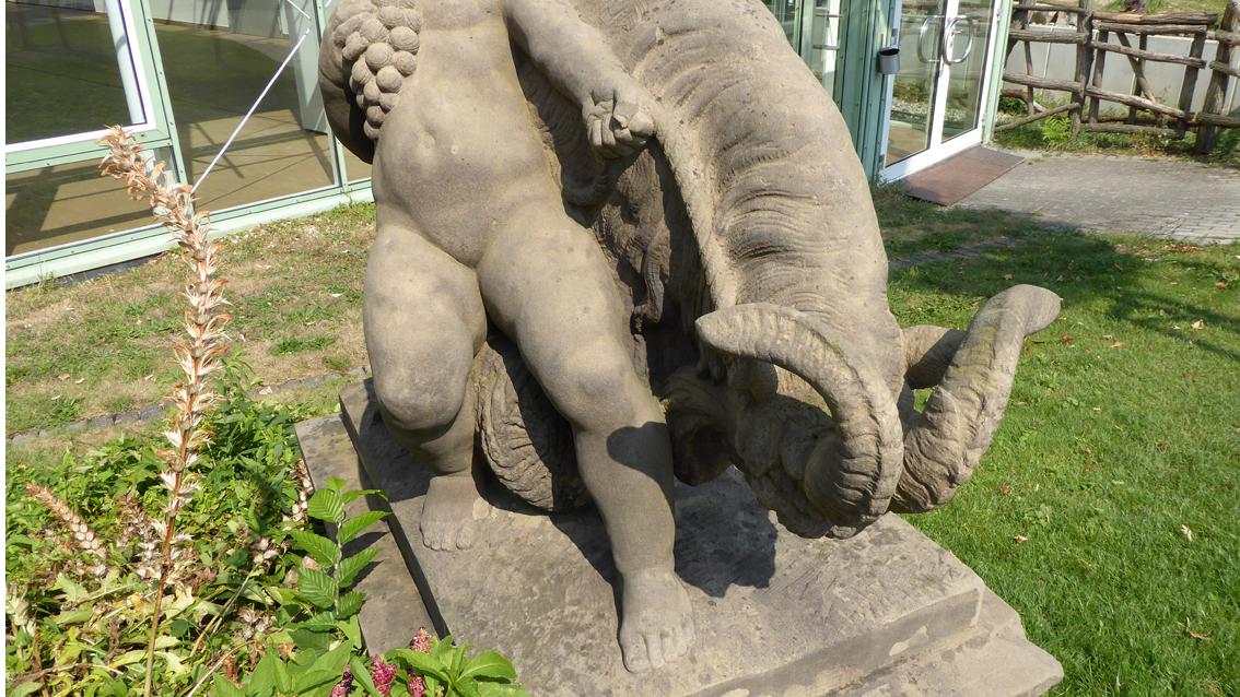 Kinder und Ziegenbock befinden sich im Zustand vitaler Verbundenheit. Ein spielerisches Kräftemessen mit gegenläufigen Bewegungen bestimmt die Skulptur, die inhaltlich und formal von klassischen Vorbildern inspiriert ist. Der Standort befindet sich vor der Gartenhalle nahe dem Exotenhaus.