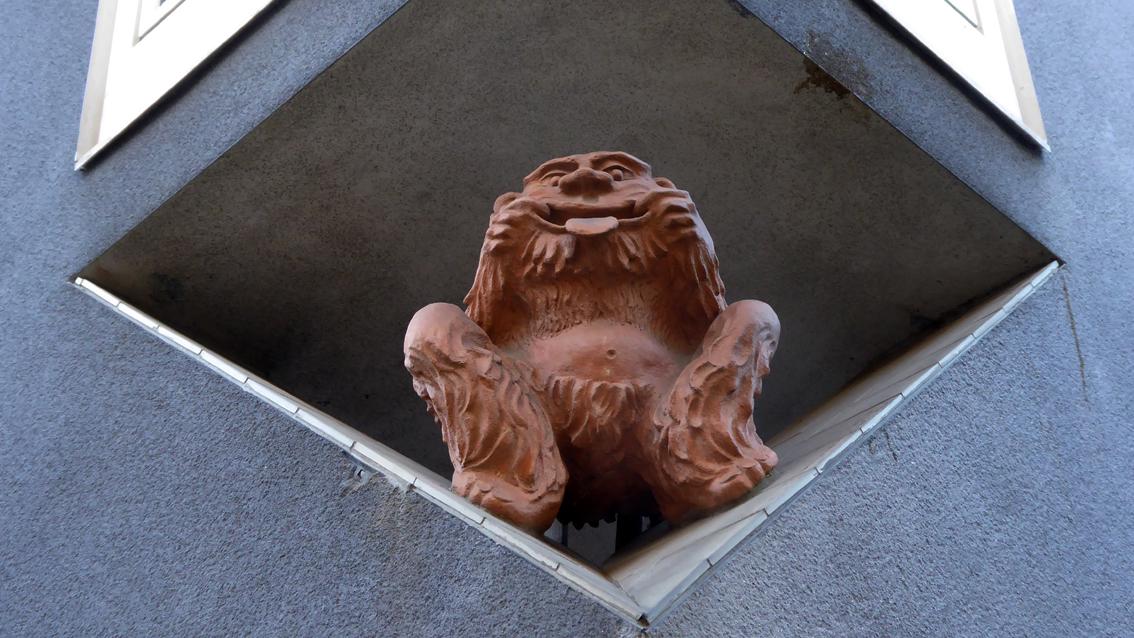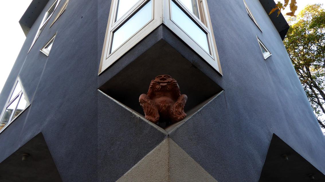 An einem Pfeiler des städtischen Atelierhauses residiert der ‚Kobold‘ von Mathias Ohndorf. Im Volksmund heißt er kurz und knapp ‚Südstadtaff‘. Mit großen Augen, breit gezogenem Mund und heraus gestreckter Zunge, nimmt die geduckt zum Absprung bereit dasitzende Fantasiegestalt Kontakt mit den Vorbeiflanierenden auf. Der bis zu seinem Tode im Jahre 2015 in Karlsruhe tätige Künstler wurde 1934 in Völklingen geboren. Er studierte an der Kölner Werkschule bei Prof. Friedrich Vordemberge und an der ‚Académie De La Grande Chaumière‘ in Paris. Im Jahre 1960 heiratete er die Textilkünstlerin und Malerin Uta Ohndorf-Rösinger, die mit einer Textilarbeit im Regierungspräsidium in Karlsruhe vertreten ist. Ebenfalls von Mathias Ohndorf stammt die vielteilige Figurengruppe ‚Blaues Gebirge‘ im Atrium des Gebäudes B der Hochschule Karlsruhe - Technik und Wirtschaft, die aus gebranntem und farbig glasiertem Ton in Zusammenarbeit mit der Staatlichen Majolika Manufaktur Karlsruhe gefertigt wurde.