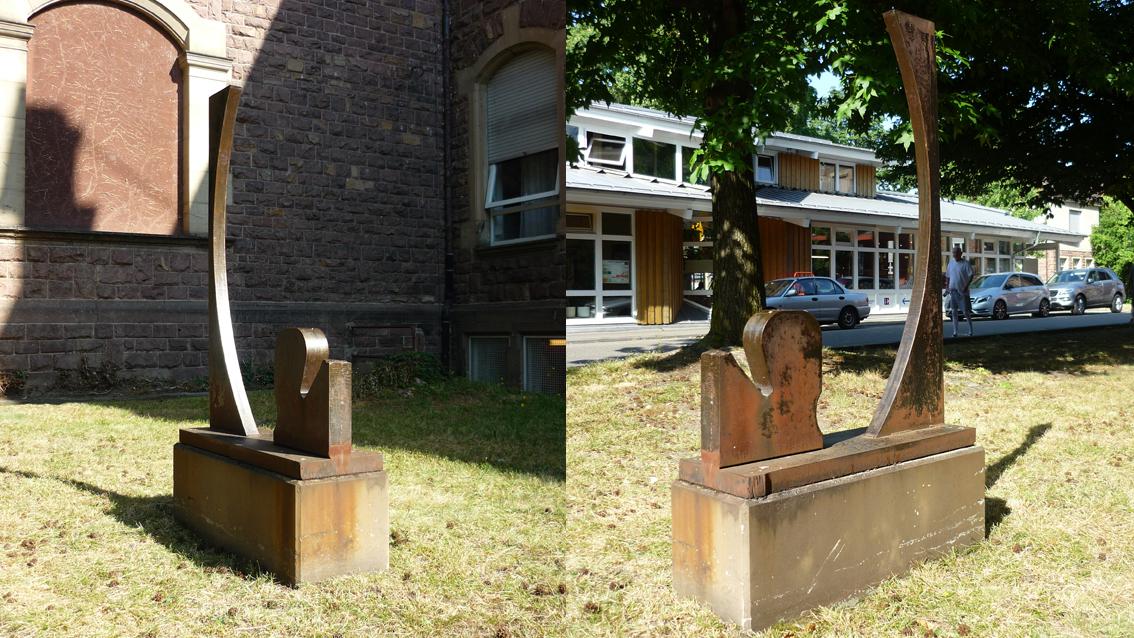 Die Stahlplastik des Künstlers befindet sich auf einer Wiese des Städtischen Klinikums, gegenüber vom zentralen Kiosk. Sie ruht mit betonter Breitenausdehnung auf einem Betonsockel. Ein vereinfachter Kopf ist auf eine große, gebogene Form bezogen. Die angewandte Formensprache ist elementar und einfach: Stilisierter Naturalismus begegnet Abstraktion in der Tradition des Konstruktivismus.