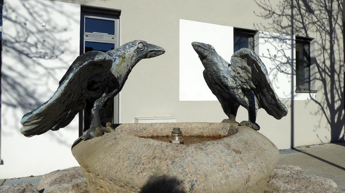 Der Stadtteil Grünwinkel geht auf die Besiedelung durch Gutsbesitzer im späten 15. Jahrhundert zurück. Früher wurde er Krähwinkel genannt, seitdem ist die Krähe gleichsam das Wappentier der dort Ansässigen. Der Brunnen besteht aus einem steinernen Becken sowie gegenständlich modellierten und abschließend in Bronze gegossenen Krähen. Finanziert wurde das Projekt von der Stadt, dem Bürgerverein und einem großzügigen Grünwinkler.