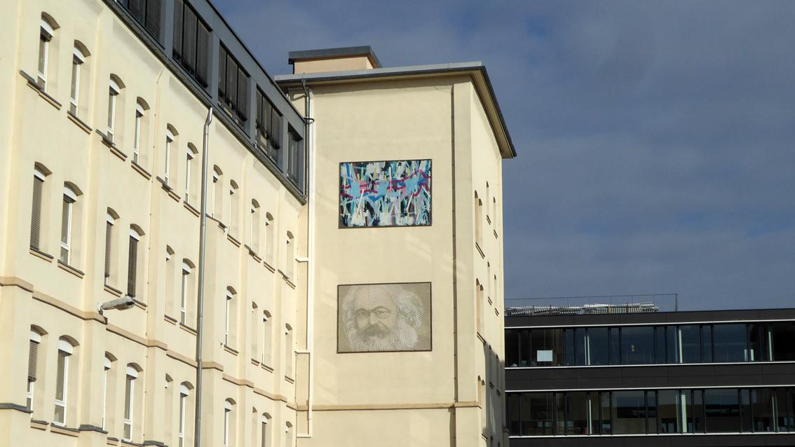 Der Maler ist Mitglied des Künstler*innenvereins ‚PlakatWandKunst‘. Seit Jahren ist diese Gruppe in der Stadt Karlsruhe, in der Region und darüber hinaus mit temporären Aktionen im öffentlichen Raum aktiv. Verbindendes Konzept ist, dass die individuellen, künstlerischen Ideen auf Holzplatten und in dem Format 260 cm auf 360 cm verwirklicht werden. Die Träger der Raumfabrik haben Werke einzelner Künstler*innen der Gruppe in den vergangenen Jahren erworben und an verschiedenen Stellen der Gebäude des Anwesens fest installiert. Der Karlsruher Maler Andreas Lau ist über die Region hinaus bekannt für seine besondere Maltechnik. Dabei setzt er Punkte verwandter Farben so neben- und übereinander, dass ein erkennbares, naturalistisches Abbild entsteht. Bei der Arbeit ‚L’Age d‘Or‘ ist deutlich Karl Marx zu erkennen. Titel und Porträtierter lassen den Betrachtenden viel Spielraum für phantasievolle Deutungen. Andrea Lau wurde 1964 geboren, von 1984 bis 1994 studierte er an der Staatlichen Akademie der Bildenden Künste in Karlsruhe bei Prof Gert van Dülmen. Er verstarb im Jahre 2024.