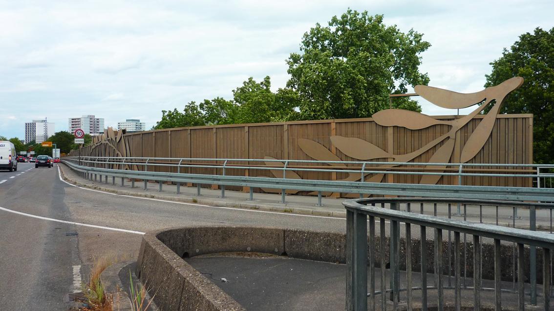 Das in seiner Breitenausdehnung monumentale Werk entstand in Zusammenarbeit mit GJL Architekten Karlsruhe. Es ging als Siegerarbeit aus einem Realisierungswettbewerb im Jahre 2005 hervor. Aufgabenstellung war, dass die zu erstellenden Lärmschutzkonstruktionen in ihrer Gestaltung den Straßen- und Landschaftsraum neu und positiv definieren sollen. Der Heilbronner Künstler Peter Riek löste die Aufgabe, indem er die Leichtmetallwände mit einem durchlaufenden Blattmotiv versah.