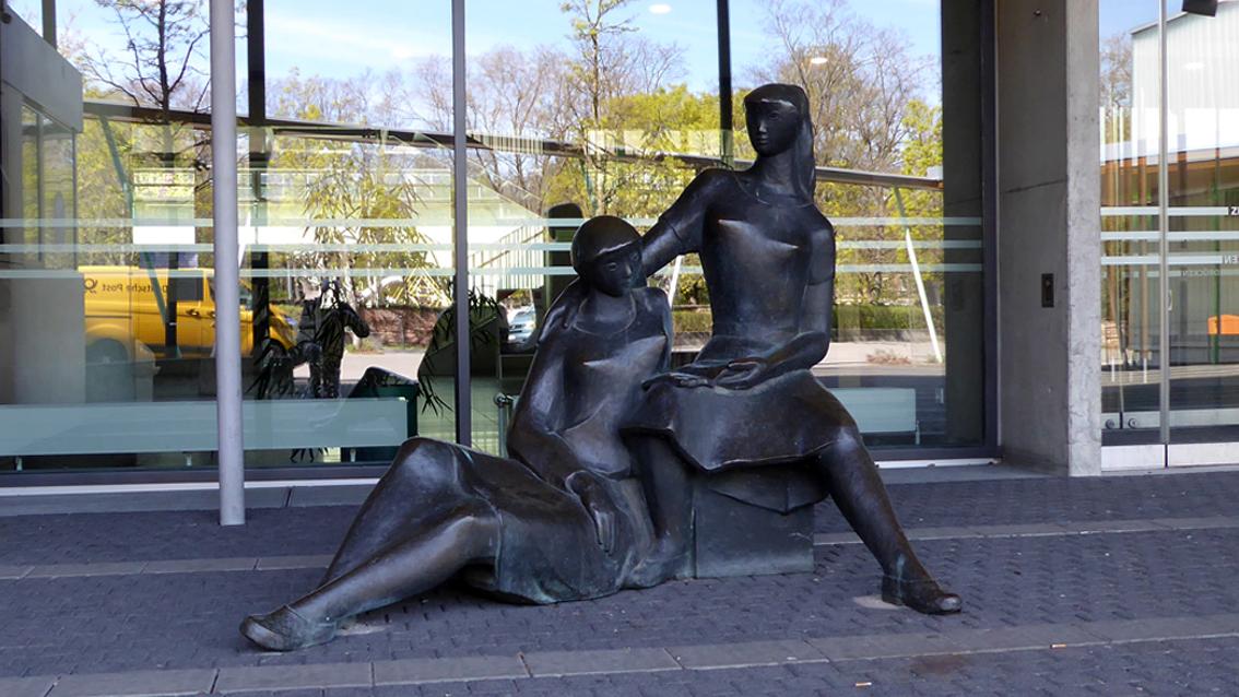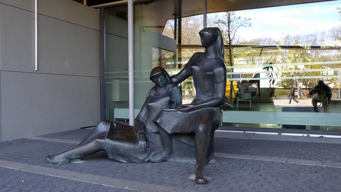 Die plastische Gruppe besteht aus zwei sitzenden, weiblichen Figuren. Durch die unterschiedlichen Kopfhaltungen und Beinausrichtungen ist das Ensemble von einer verhaltenen Lebendigkeit erfüllt. Der Künstler studierte bis 1934 an der Landeskunstschule bei Christoph Voll, der Vorläufereinrichtung der Staatlichen Akademie der Bildenden Künste Karlsruhe. Der Figurenstil ist gegenständlich mit abstrahierenden Vereinfachungen, wie er typisch ist für die Skulptur der Nachkriegszeit.