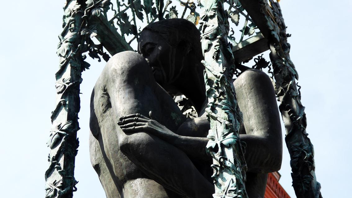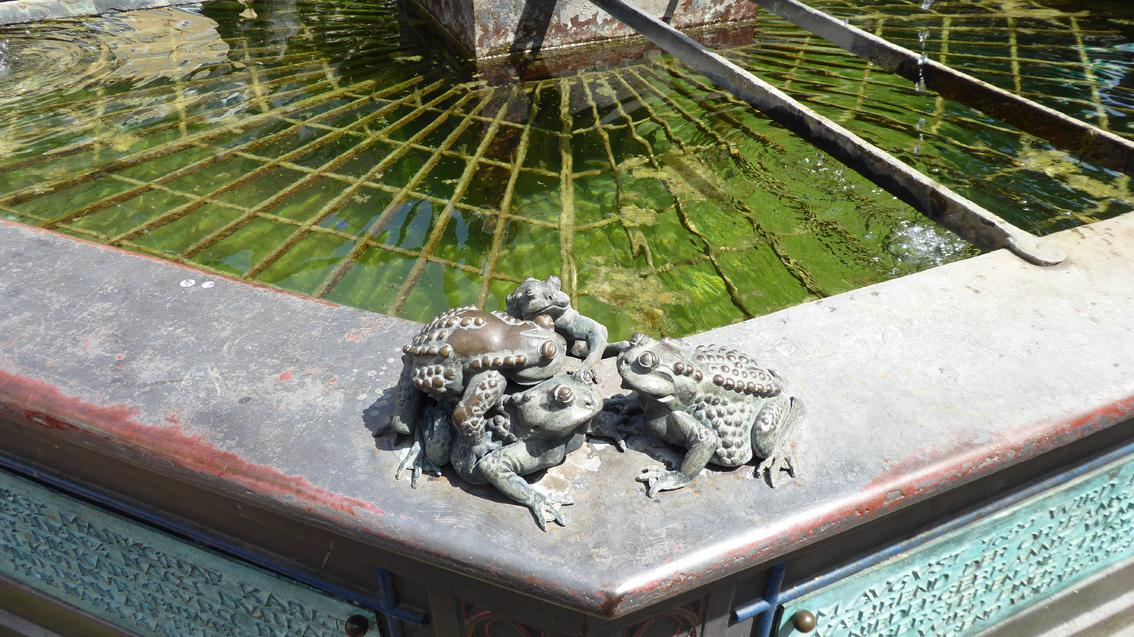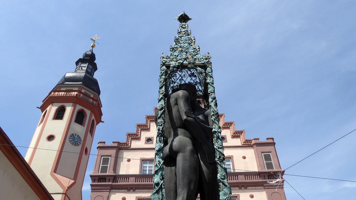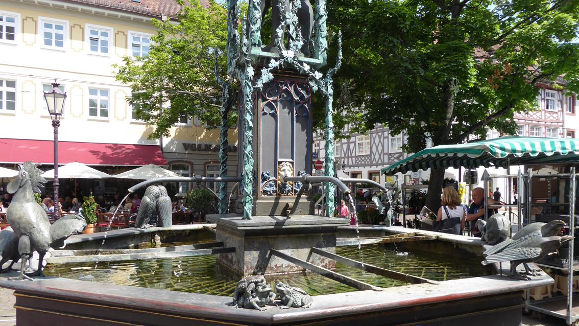 Der Trog der Brunnenanlage aus Gusseisen stammt aus dem 19.Jahrhundert. In dessen Mitte befindet sich ein ca. zwei Meter hoher Podestquader mit vier Wasserspeiern. Im Jahre 1992 wurde der Brunnen durch den Bildhauer Klaus Ringwald ergänzt und neu gedeutet. Der Künstler aus dem Schwarzwald wurde an der Akademie der Bildenden Künste in Nürnberg ausgebildet. Er arbeitete und lebte in Schonach, wo er im Jahre 2011 verstarb. Ringwald schuf mehrfach Plastiken für den öffentlichen Raum, vorwiegend in Städten Süddeutschlands, aber auch in Großbritannien. So realisierte er am Christ-Church-Gate der Kathedrale in Canterbury einen 'Christus auf dem Thron'. Auf dem Marktplatz in Durlach geht es dagegen weltlich zu. Unter einem Baldachin steht ein lebensgroßes, nacktes Liebespaar, das sich zärtlich umarmt und in den Eckbereichen des Brunnentrogs kommen sich unterschiedliche Tierpaare nahe.