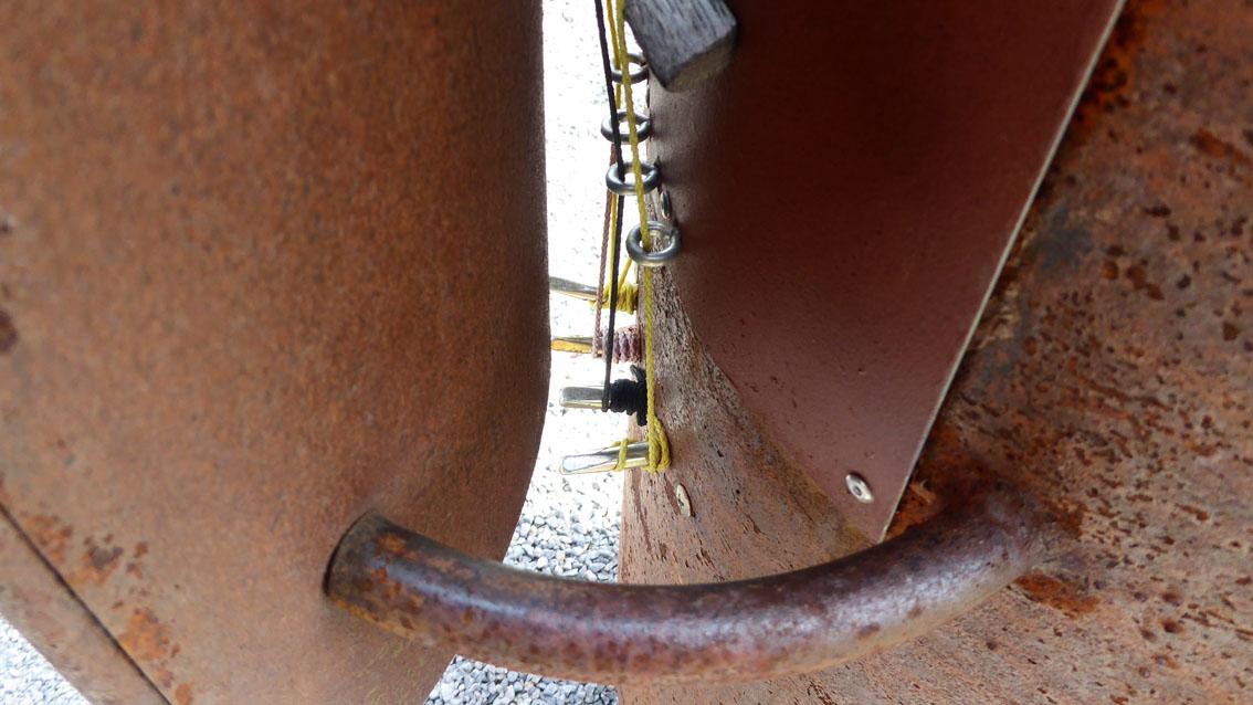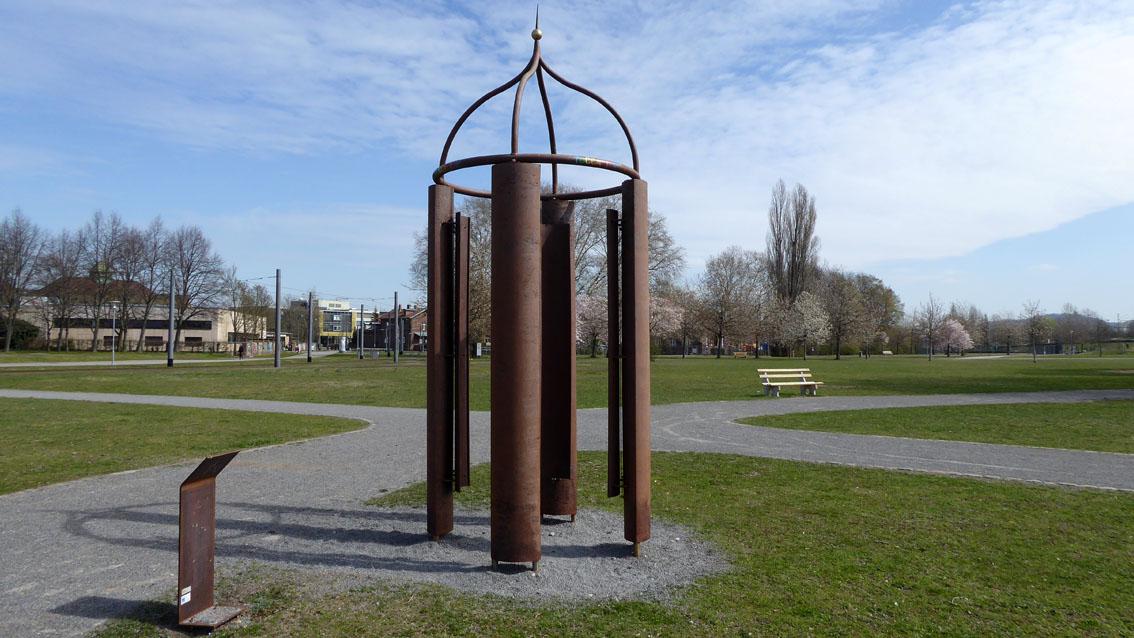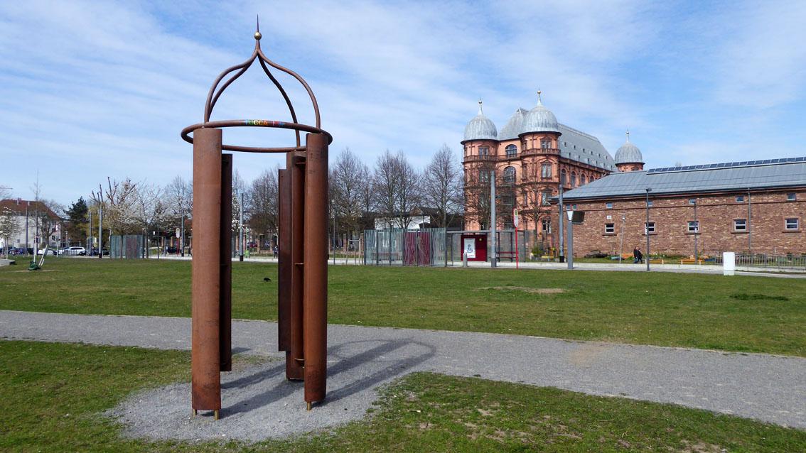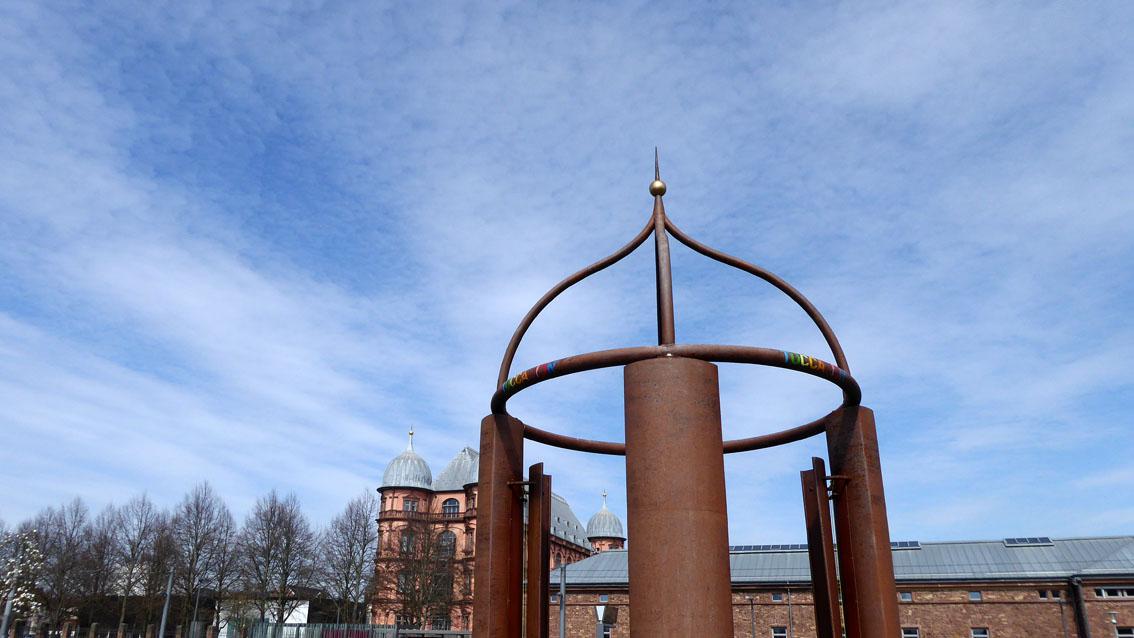 In Sichtweite zum Schloss Gottesaue, in dem sich die Hochschule für Musik Karlsruhe befindet, installierte die Oldenburger Wind- und Klangkünstlerin Jutta Kelm ihr Werk mit dem Titel ‚Luftschloss‘. Stark abstrahiert, zitiert die Außenform der Klangplastik Bauformen des Schlosses. In den Trägerteilen der filigranen Konstruktion, die auch als Resonanzkörper dienen, befinden sich vertikal verlaufende Kunststoffsaiten, die je nach Windintensität in Schwingung versetzt werden und so ohne Musikerpräsenz verschieden laute Töne erzeugen.