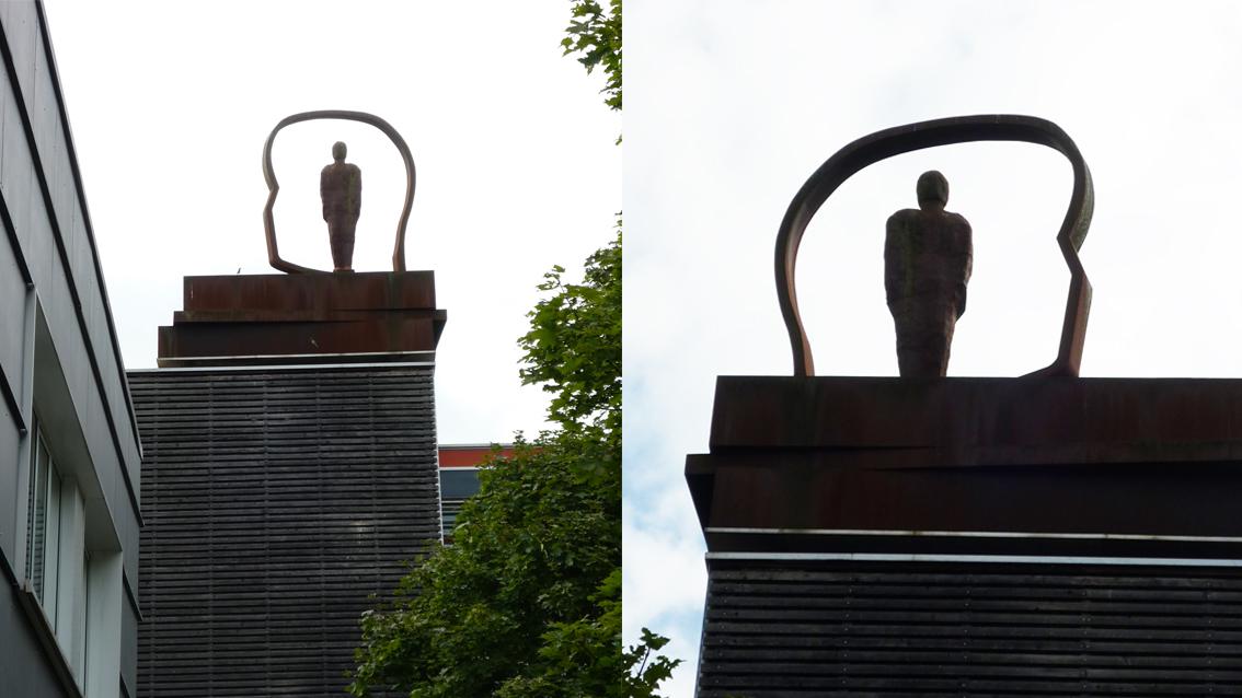 Auf dem Dach der Schule befindet sich eine plastische Gruppe des Künstlers Hermann Weber, der an der Staatlichen Akademie der Bildenden Künste in Karlsruhe bei Horst Antes ausgebildet wurde. Sie besteht aus einer Sockelkonstruktion mit einer menschlichen Figur in aufrechter Haltung. Sockel und Figur werden umrahmt von einem geschwungenen Band, das ein menschliches Profil andeutet. Auf Untersicht angelegt, umkreist das Kunstwerk zeichenhaft das Thema ‚Mensch und Raum‘ mit einfachen künstlerischen Mitteln und unspektakulären Materialien.