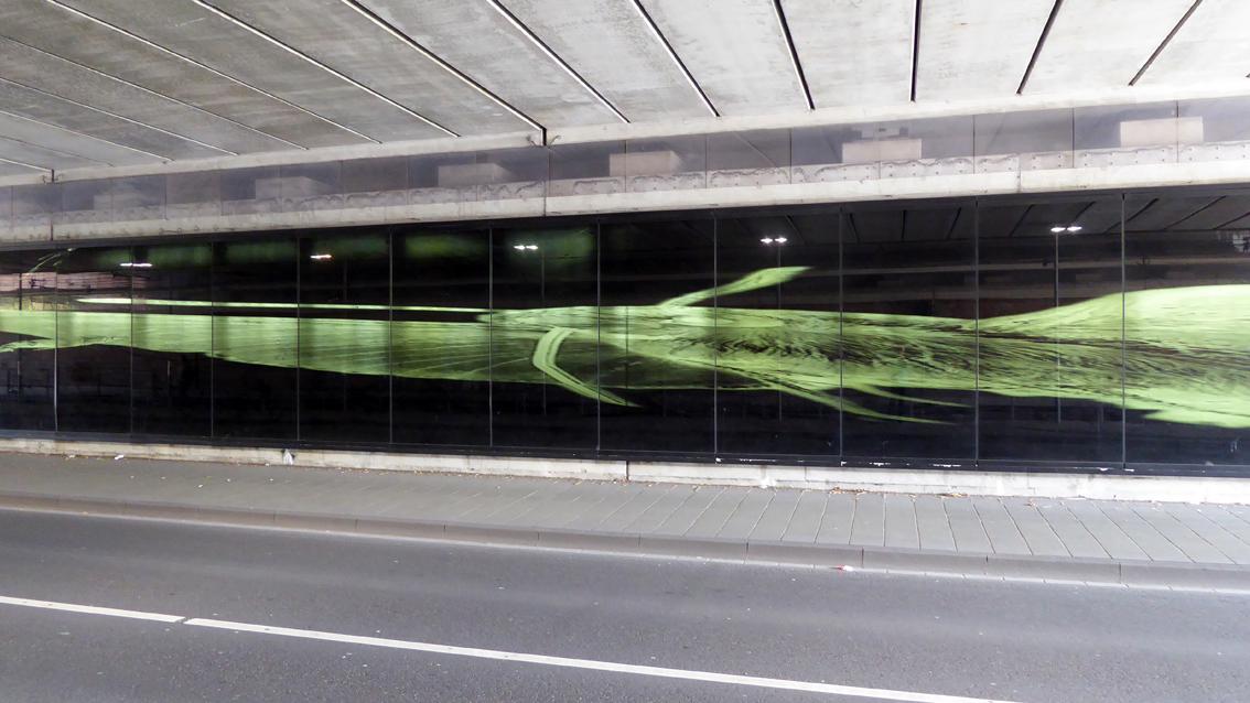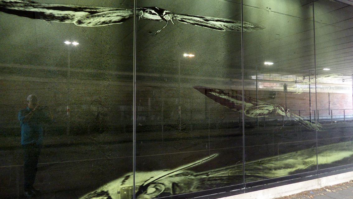 Das großformatige Kunstwerk zeigt vergrößerte Motten im Flug. Die Motive sind auf Glas gedruckt und hinterleuchtet. Auf subtile Weise antwortet die Arbeit auf die Besonderheit des Ortes, eine Straßenunterführung, in der sich Menschen und Fahrzeuge entlang der ca. 60 Meter breiten und ca. 3 Meter hohen Lichtinstallation ganztägig bewegen. Je nach Distanz und Geschwindigkeit eröffnen sich unterschiedliche Ansichten.