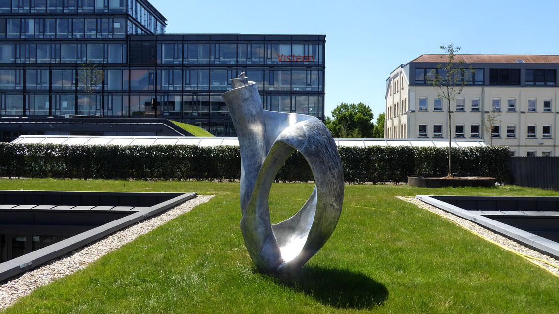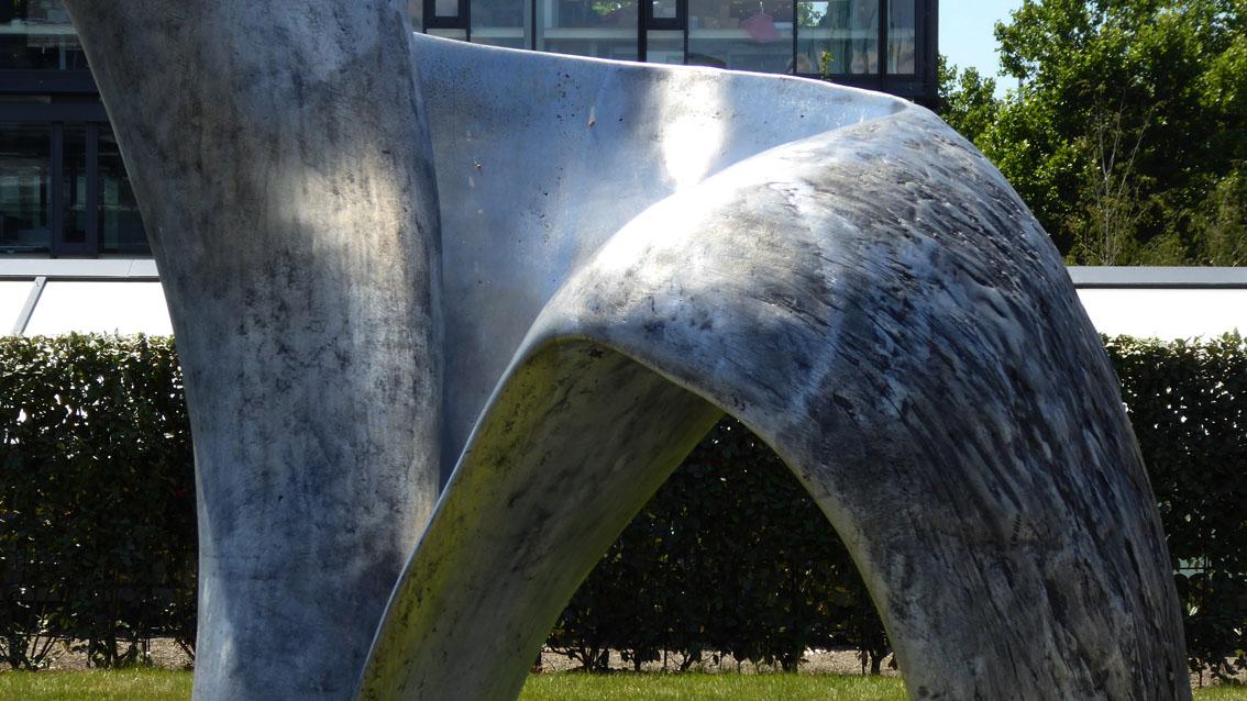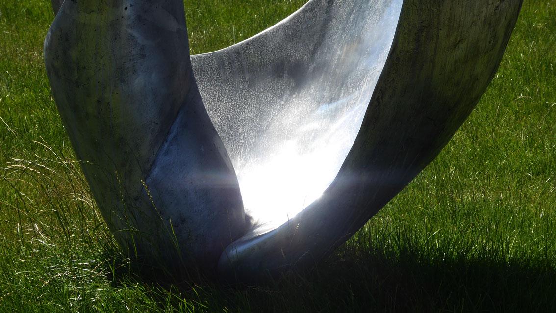 Jürgen Zimmermanns Plastik befindet sich auf einer kleinen Anhöhe des neu gestalteten Geländes der Raumfabrik. Der Aluminiumguss wirkt zunächst ungegenständlich und organisch. Beim genauen Hinsehen fallen Oberflächenkontraste auf. An einigen Stellen erscheint die Plastik glatt und verspiegelt, an anderen durch Vertiefungen und Einkerbungen aufgeraut und matt. Die muschelähnliche Komposition entwickelt sich dynamisch vom großen ins kleine. Unten startet sie einer Schale gleich, die das Sonnenlicht einfängt, oben endet sie in einer Spiralform, die sich zum Himmel hin verjüngt. Das kompakt wirkende Kunstwerk steht auf einem einzigen Punkt, ist manuell drehbar und bewegt sich bei starkem Wind von selbst. Der Karlsruher Bildhauer, Installationskünstler und Maler wurde im Jahre 1953 in Büchenau geboren. Zwischen 1974 und 1980 studierte er an der Staatlichen Akademie der Bildenden Künste in Karlsruhe bei den Professoren Kindermann, Loth, Akiyama und Hajek.