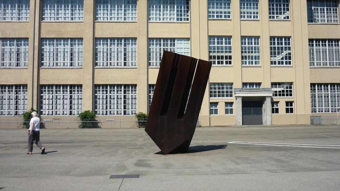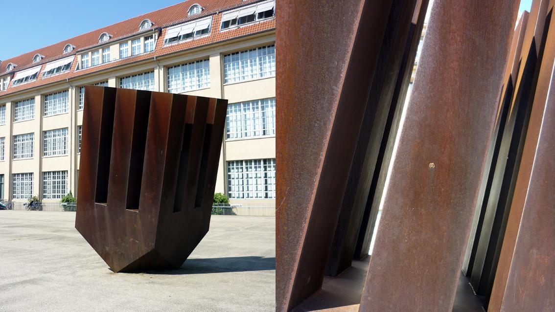 Werner Pokorny ist einer der renommiertesten Stahlbildhauer Deutschlands. Er lehrte als Hochschullehrer in Karlsruhe und Stuttgart. In einer elementaren Formensprache und vorwiegend in Cortenstahl ausgeführt, umkreist der Künstler das Motiv ‚Haus‘. Der Titel der Arbeit auf dem Vorplatz des ZKM betont die nach oben ausgerichteten Pfeiler eines auf dem Dach liegenden Hauses. Zugleich himmelwärts ausgerichtet und umgestürzt daliegend, umgibt das Kunstwerk eine beunruhigende Spannung. Werner Pokorny verstarb am 31. Dezember 2022.