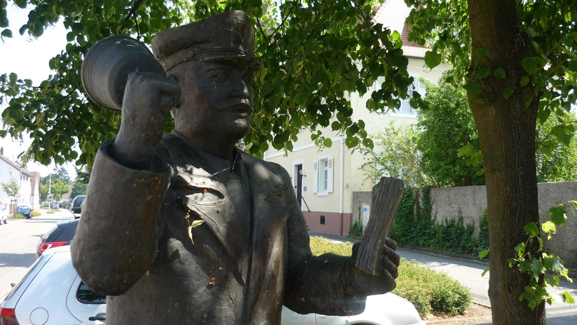 Büttel bedeutete früher Amtsbote, Gerichtsdiener, auch Polizist. Der Neureuter Büttel umkreist diese Aufgabenfelder umfassend: Der zielgerichtete Blick verrät zusammen mit der Respekt einfordernden Mütze den Polizisten in ihm, die Glocke und das Buch sorgen für Aufmerksamkeit und verweisen auf die Bedeutung dessen, was er zu verkünden hat. Etwas bürokratisch ungelenk, hat ihn der Bildhauer modelliert, in Bronze gegossen und abschließend am Straßenrand auf einem Natursteinsockel eher hingestellt als erhöht.