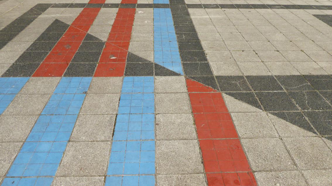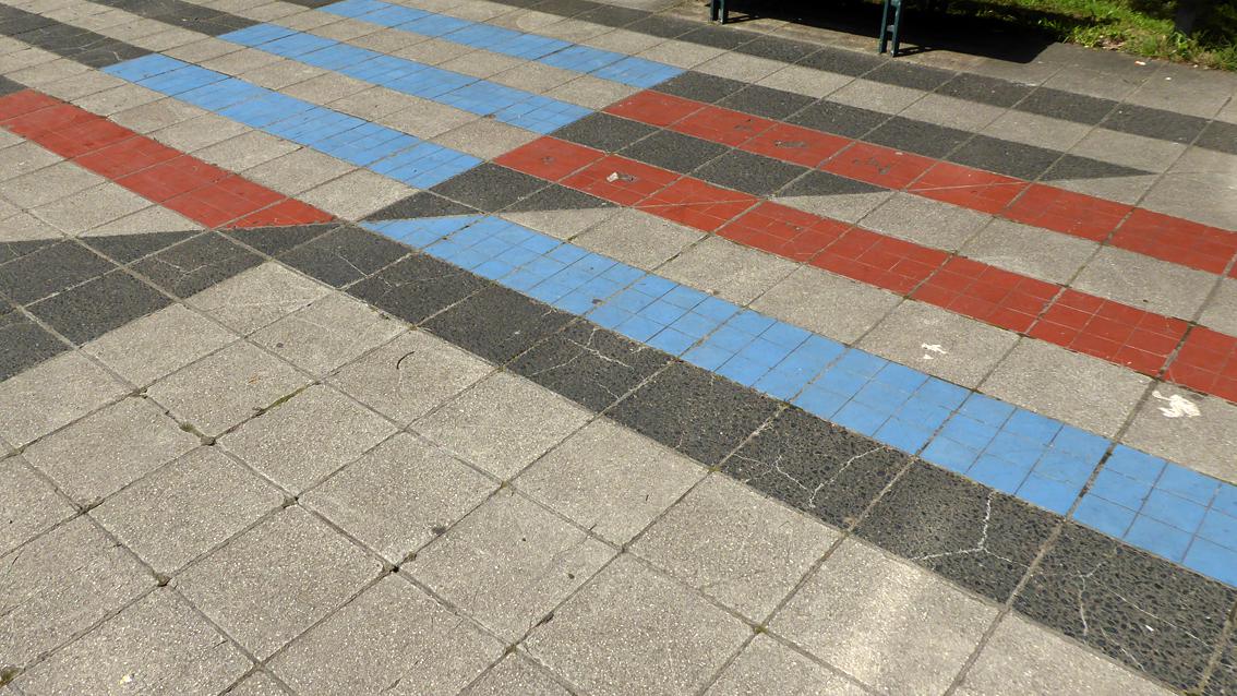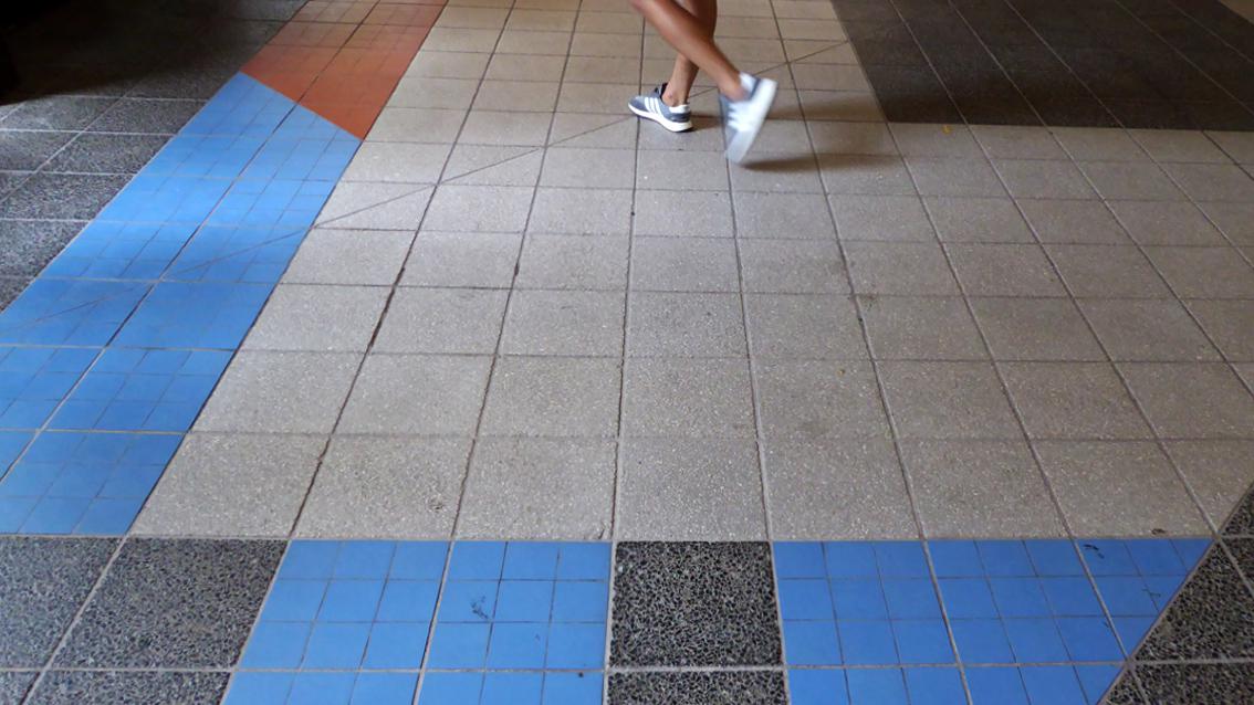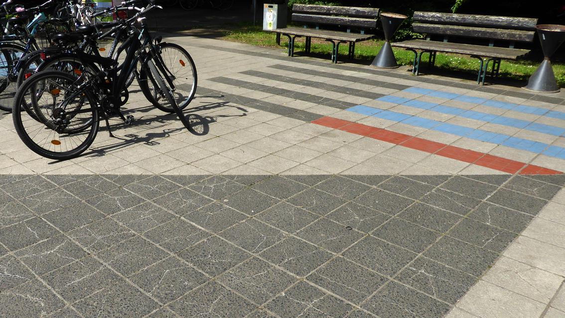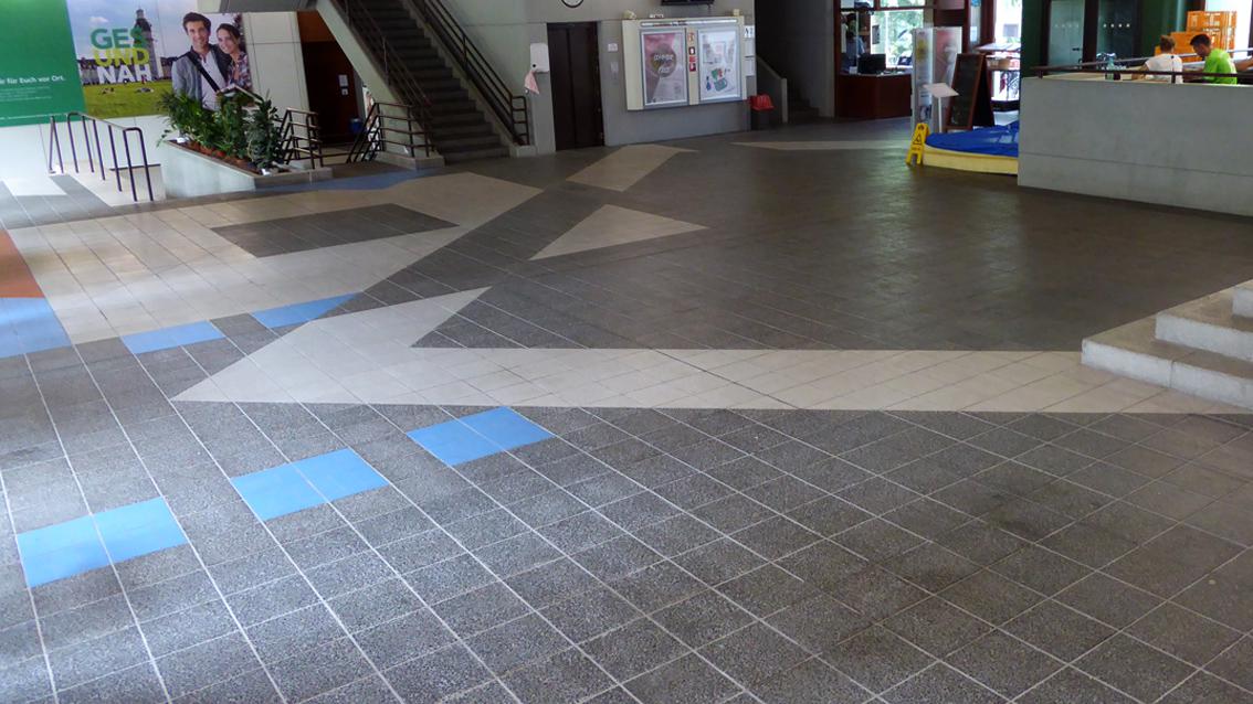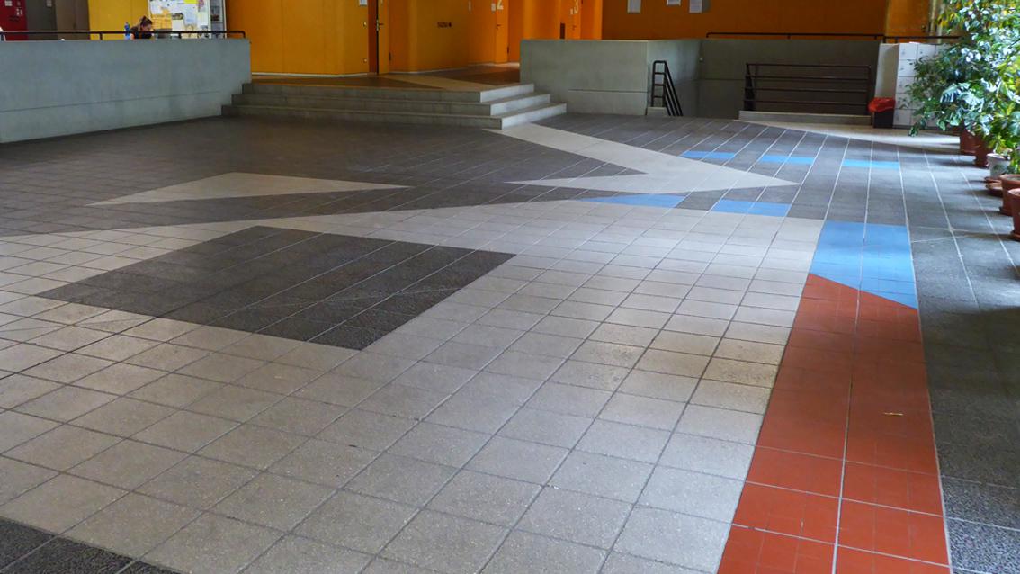 Der Künstler gestaltete in den Jahren 1976 bis 1978 unter Verwendung von Kunststein und Keramikplatten den Vorplatz und das Foyer des Instituts für Sport und Sportwissenschaft. Es entstand eine Bodenfläche mit differenzierten Grauabstufungen und farbigen Akzentuierungen, hauptsächlich in Rot- und Blautönen. Durch die künstlerischen Eingriffe sind Innen und Außen schlüssig verbunden. Frido Lehr studierte nach einer Steinmetzlehre an der Bauhütte der Heilig-Geist-Kirche in Heidelberg an der Freien Akademie in Mannheim. Er wurde 1928 in Sinsheim geboren, lebt und arbeitet in Karlsruhe.
